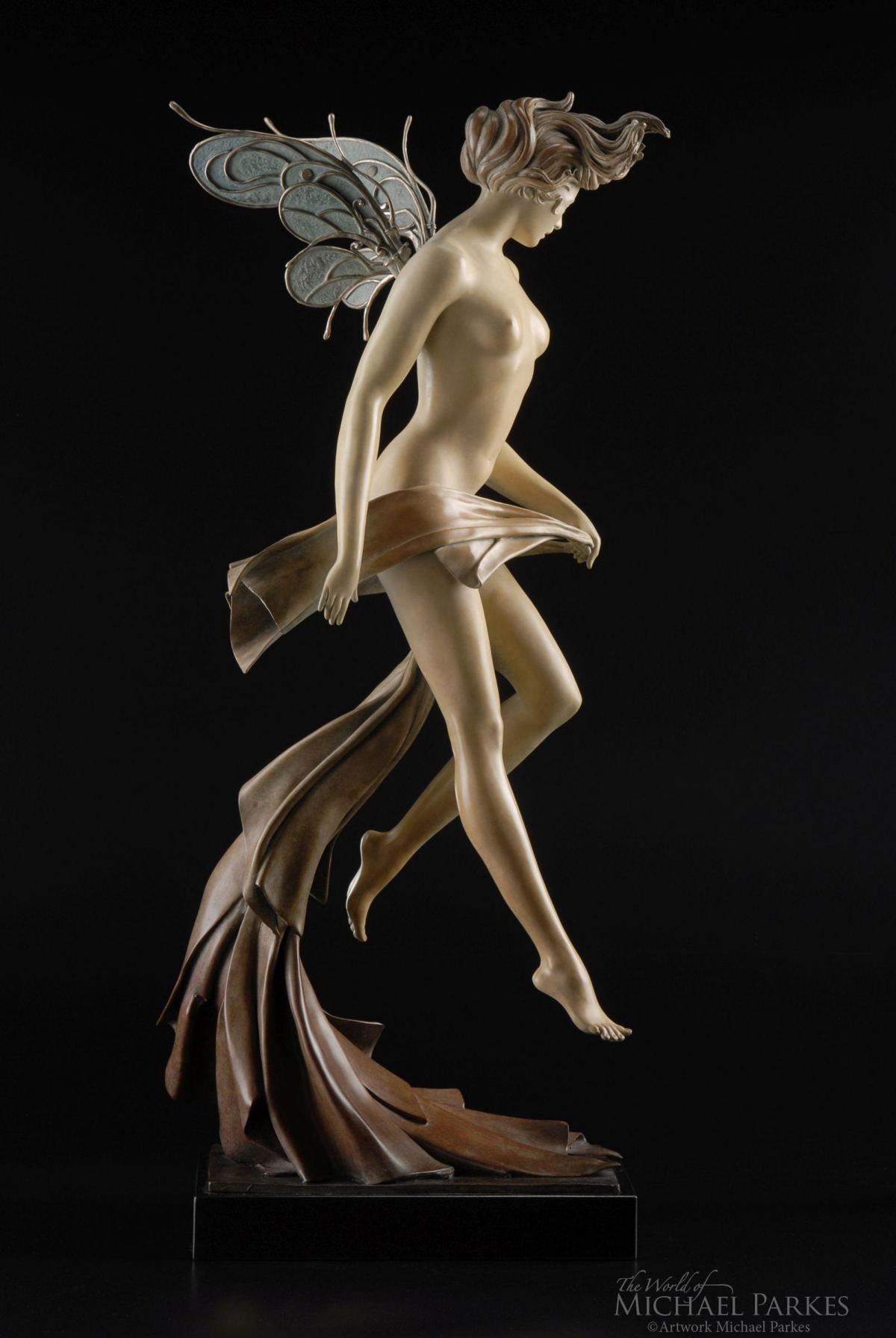Artist: Michael Parkes. Medium: Bronze Sculptures. Title: Startled Sky Nymph. Size: 30”T x 13”W x 16”D. 90. : A note from Michael Parkes—The sky nymph sees me out the corner of her eye. She is startled, but not because I caught her by surprise, but by the fact that I can see her at all. She is normally invisible to humans..