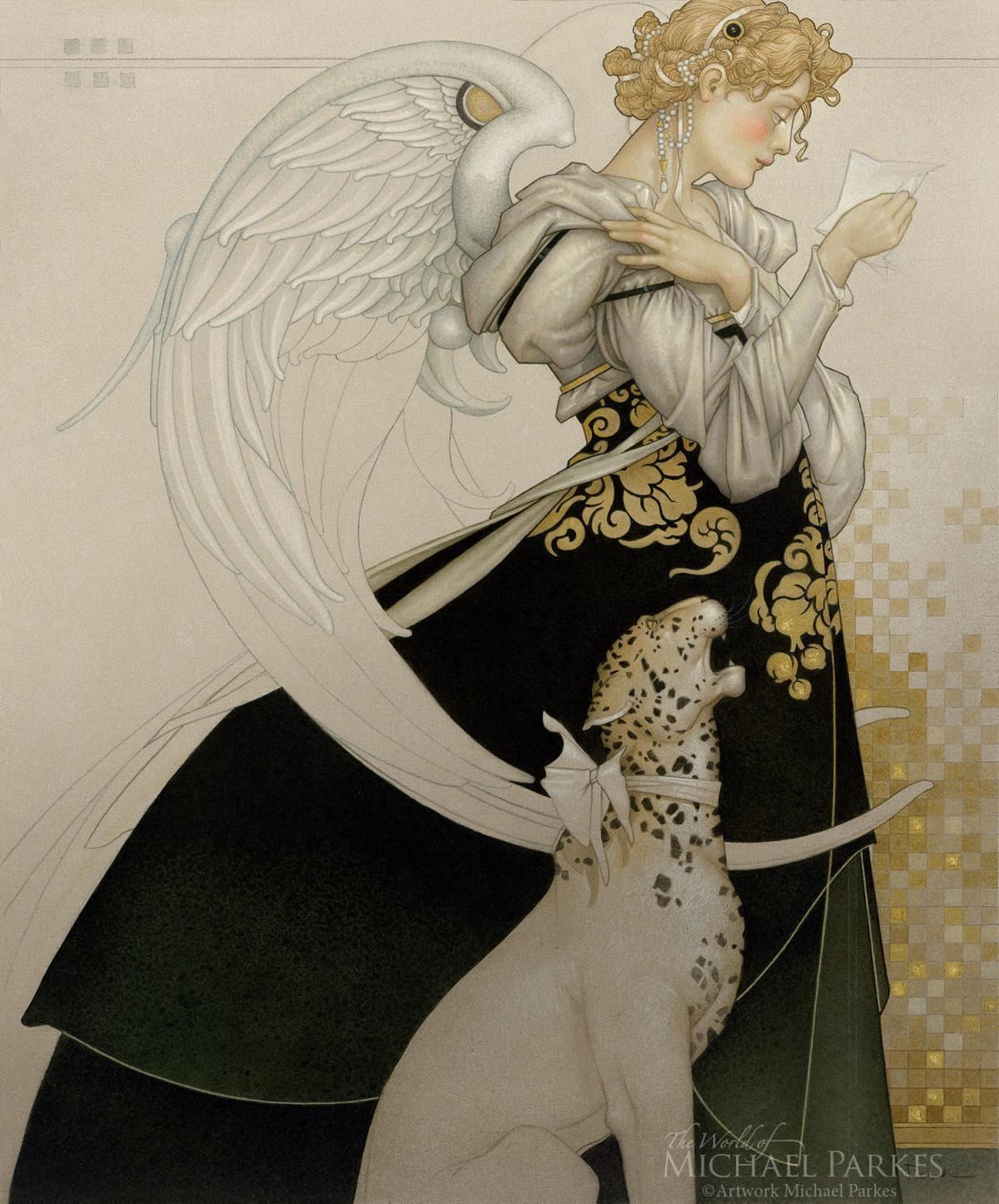 Artist: Michael Parkes. Medium: Masterworks on Canvas. Title: The Letter Study. Size: 23 x 23½”. 25. After millions of years the king of beasts exists, but only just. It is said that each animal species has a protective guardian. Here she is the deva of lions, the one who has for so long nurtured them as they grew into their stature of grandeur. He is dying, the last lion. What do those angel-protectors do when the last of their species is gone? What must she feel, waiting for her last son's last breath on earth?