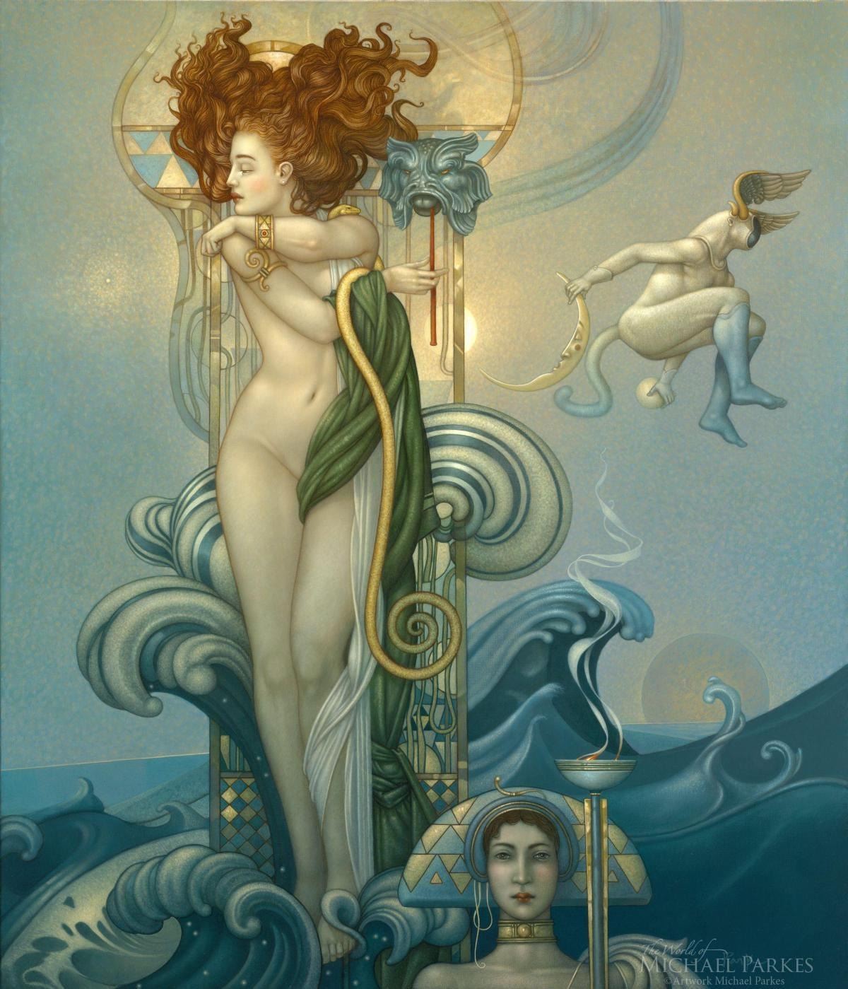 Artist: Michael Parkes. Medium: Masterworks on Canvas. Title: Venus. Size: 32½”x 39¾”. 120. "In an old English nursery rhyme, there is the line, 'Tuesday's child is full of Grace'. But 'Grace' is not a gift that comes without effort. Before Grace manifests itself, there is a time of great aspiration, preparation and hard work. However, Grace is not calculable or bound by logic". - Michael Parkes