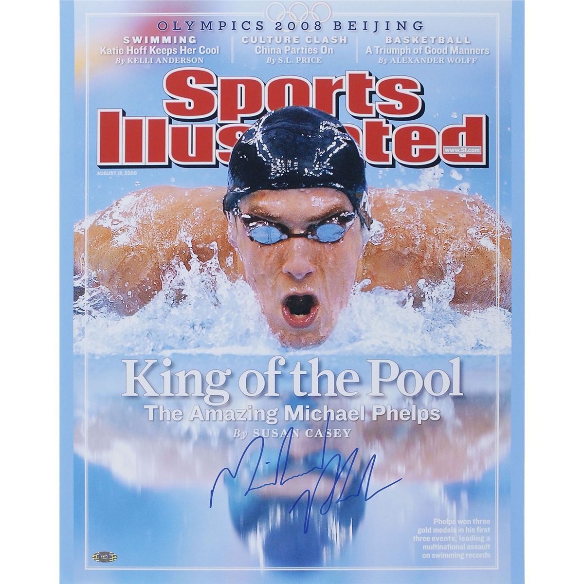 Color glossy 16 x 20 photo of a Sports Illustrated cover featuring Phelps during the 2008 Olympics, signed in blue felt tip. In fine condition, with a Steiner label affixed to the lower left (certificate of authenticity not present).