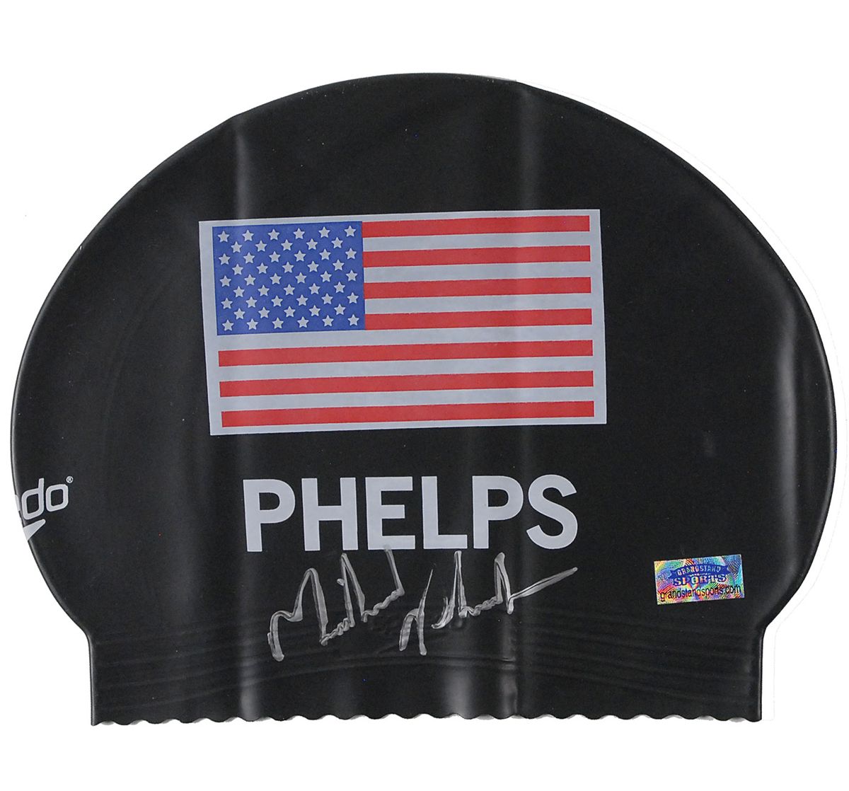 Black rubber Speedo swim cap featuring an American flag and Phelps’s name on the side, signed below in silver ink. In fine condition. Accompanied by a photo taken at the time of the private signing.