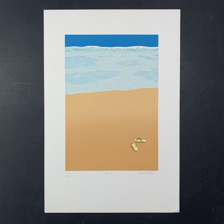 Michael Potter's "Beach I" limited edition print, signed lower right, titled lower middle, and numbered 79/250 lower left. This piece is of a pair of sandals on the beach, with a small wave coming towards the sand. This piece is in near excellent condition with a miniscule crease lower right corner, miniscule wrinkle lower left corner, and minscule wrinkle upper left corner
