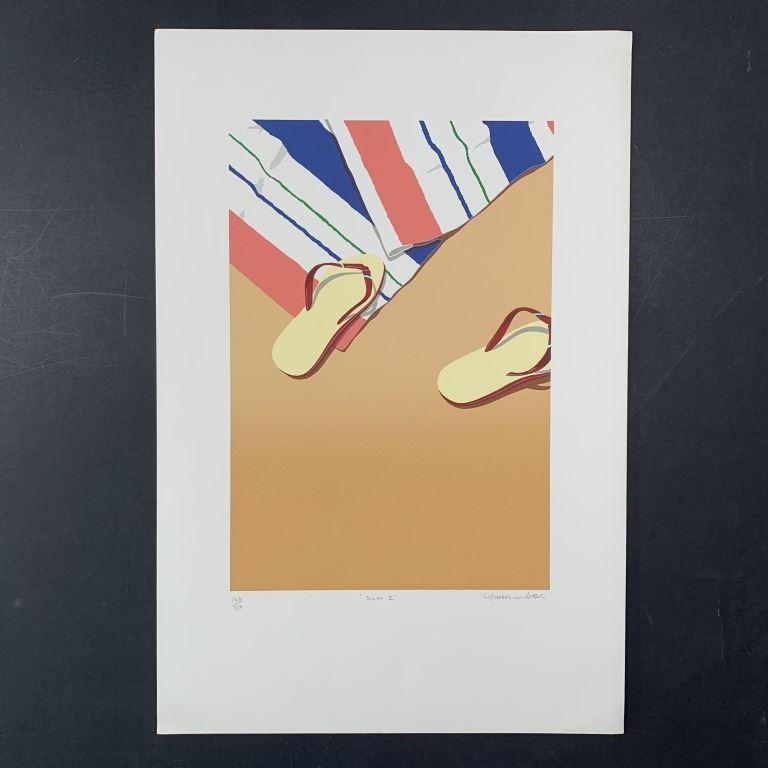 Michael Potter's "Swim I" limited edition print, signed lower right, titled lower middle, and numbered 164/250 lower left. This piece is of a pair of sandals on the beach, with part of two towels. This piece is in near excellent condition with very minor wrinkles lower left and upper right corners.