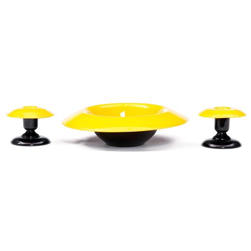 Michael Powolny style folded bowl and candleholders, two, black and yellow fused glass, each with acid stamp "Czechoslovakia", bowl: 11"dia., mint condition