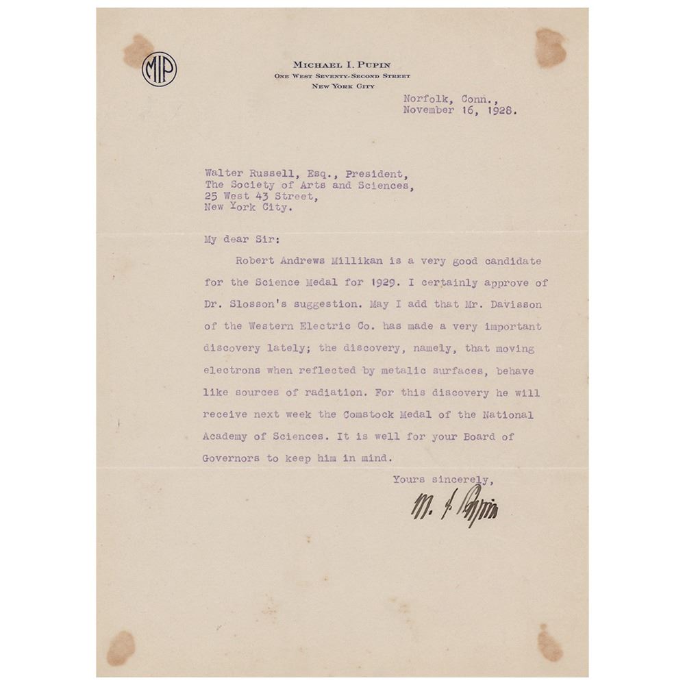 TLS signed “M. I. Pupin,†one page, 7.75 x 10.5, personal letterhead, November 16, 1928. Letter to Walter Russell, president of the Society of Arts and Sciences in New York City, recommending Robert A. Millikan or Clinton Davisson for an award. In full: "Robert Andrews Millikan is a very good candidate for the Science Medal for 1929. I certainly approve of Dr. Slosson's suggestion. May I add that Mr. Davisson of the Western Electric Co. has made a very important discovery lately; the discovery, namely, that moving electrons when reflected by metallic surfaces, behave like sources of radiation. For this discovery, he will receive next week the Comstock Medal of the National Academy of Sciences. It is well for your Board of Governors to keep him in mind." In very good to fine condition, with stains at the corners from old adhesive residue on the back.