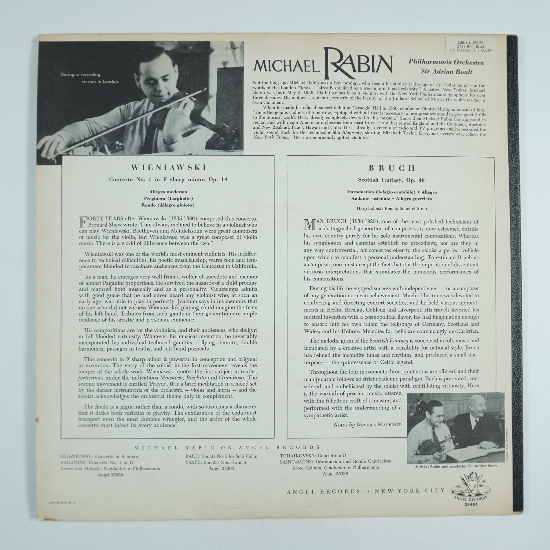 Original pressing of Wieniawski Violin Concerto No. 1 and Bruch Scottish Fantasy, performed by Michael Rabin with the Philharmonia Orchestra under the direction of Sir Adrian Boult. Released on Angel Records, this classical album features two of the most virtuosic violin pieces in the repertoire, showcasing Rabin's technical brilliance and expressive artistry. Michael Rabin (1936-1972) was an American violin prodigy renowned for his dazzling technique and lyrical interpretations. A child prodigy, Rabin made his Carnegie Hall debut at just 15 years old and went on to record with some of the most prestigious orchestras of his time. His performances remain highly regarded by classical music enthusiasts, and his recordings are considered some of the finest examples of violin artistry.