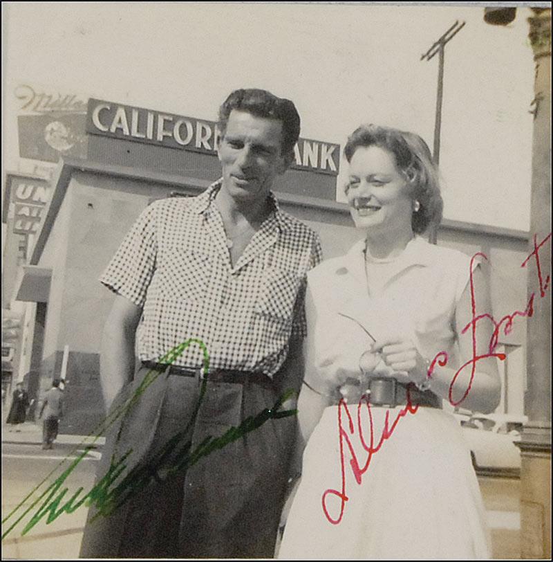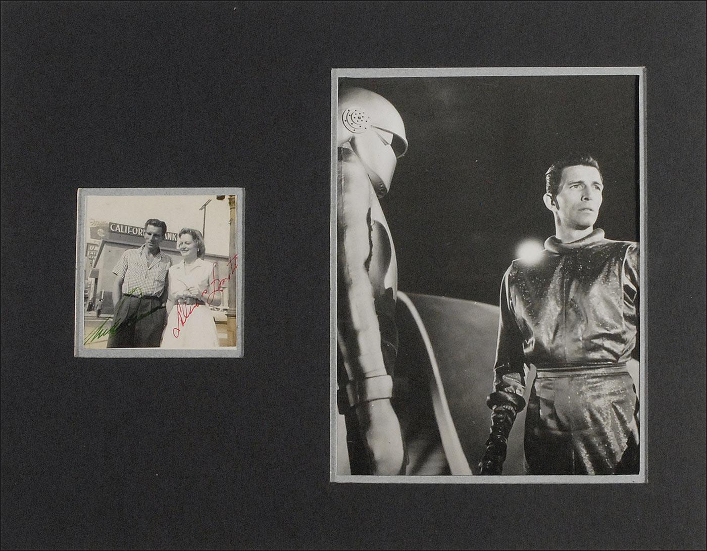 British actor (1909–1971) best known for his lead role in the science-fiction classic The Day the Earth Stood Still and as Harry Lime in TV’s The Third Man. Vintage 3 x 3 candid snapshot photo of Rennie and Alexis Smith on a street corner, signed in green ink by Rennie and in red ink by Smith. Matted with a glossy photo of Rennie from The Day the Earth Stood Still to an overall size of 14 x 11. In very good condition, with scattered creases and surface marks.