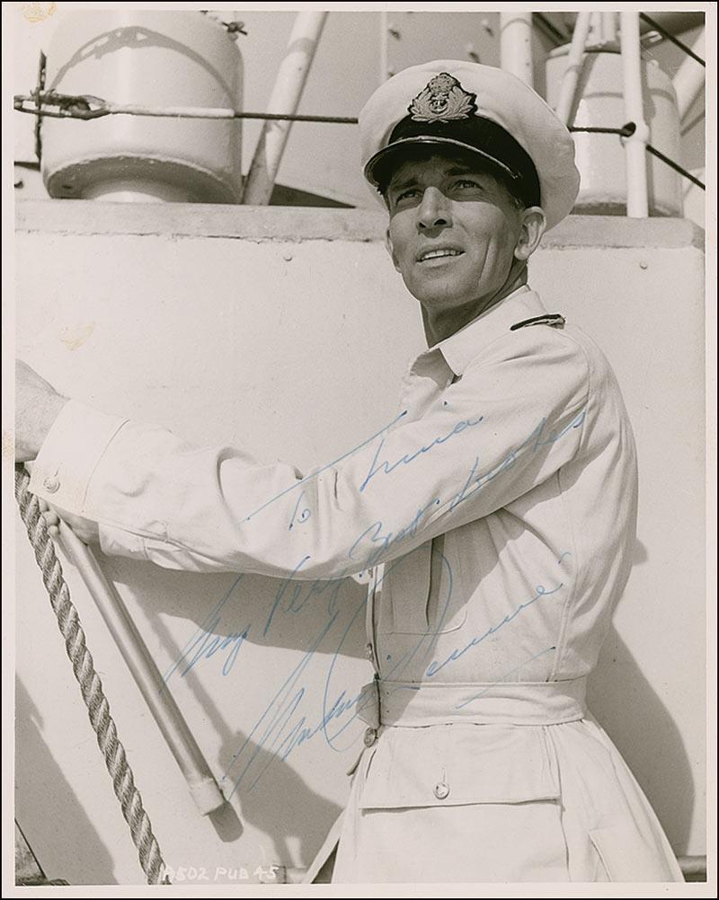 Vintage glossy 8 x 9.75 publcity photo, signed and inscribed in fountain pen “To Trina, My Very Best Wishes, Michael Rennie.” Scattered surface scuffs and marks, a couple of creases, and a spot of soiling at the top edge, otherwise fine condition.