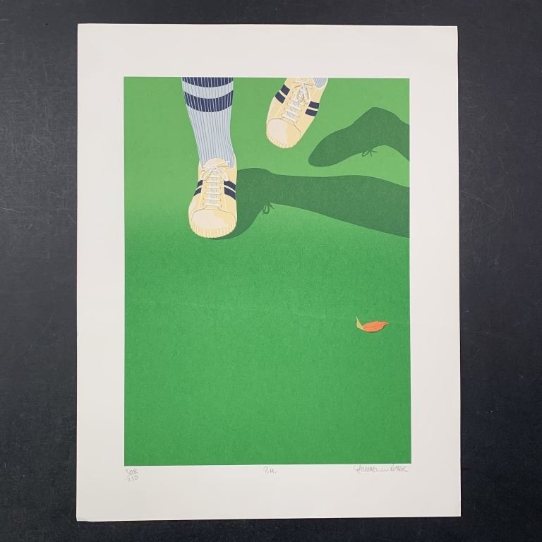 Michael Rotter's "P.M." Limited Edition Print. Someone is walking towards the artist. A leaf is on the green grass. This piece is signed in the lower right, numbered 208/250 in the lower left and titled in the lower middle. It is in excellent condition