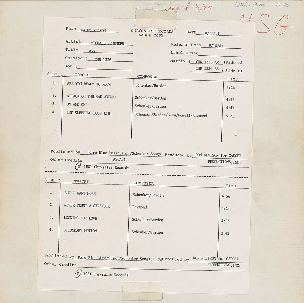 Columbia Record Productions double-sided 12? vinyl test pressing of the Michael Schenker Group’s 1981 album MSG, featuring both sides of the final release. White Columbia labels on both sides are blank. In fine condition. Accompanied by the original sleeve and Chrysalis Records informational sheet dated August 17, 1981 (one month before the album’s release), featuring the track listing for each side.