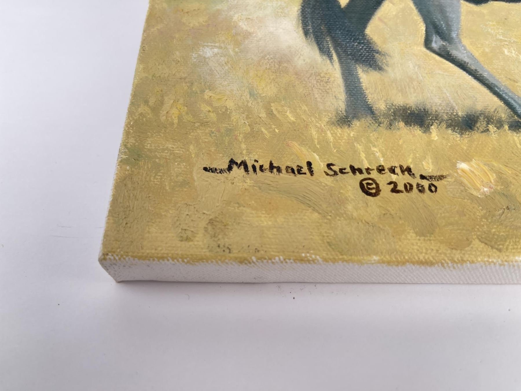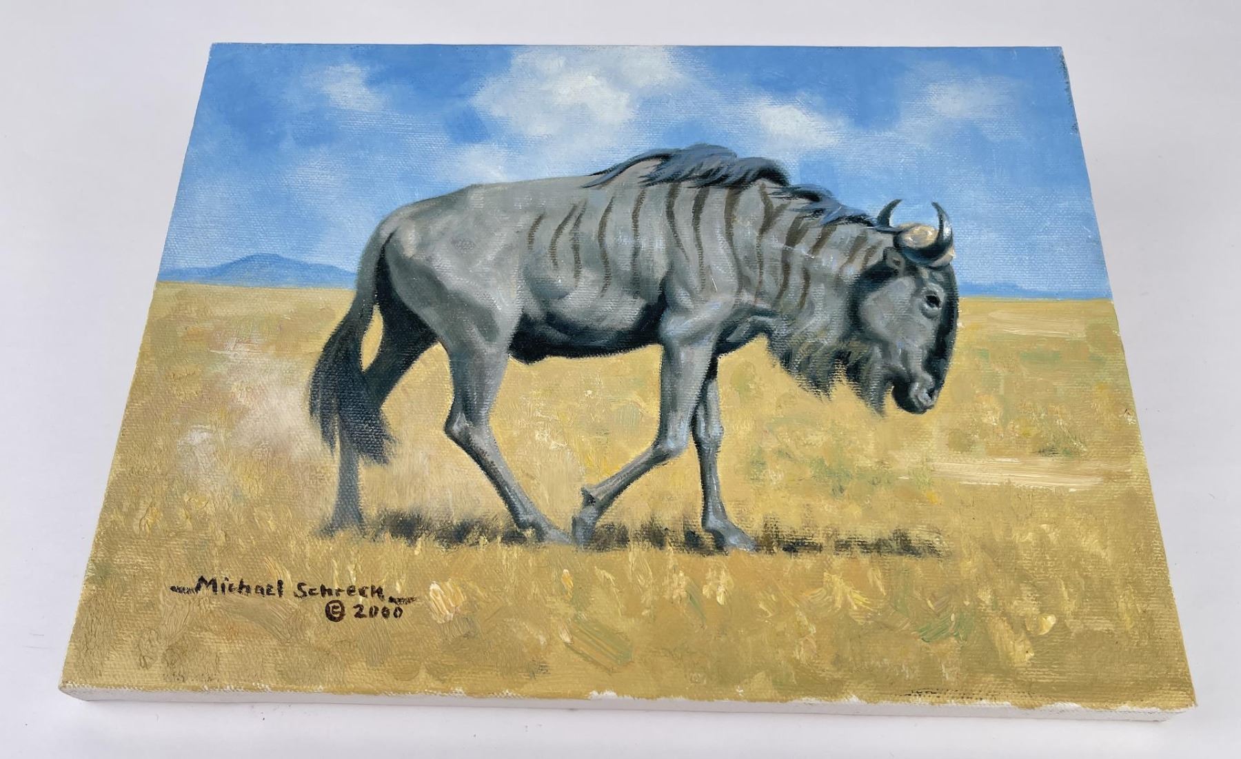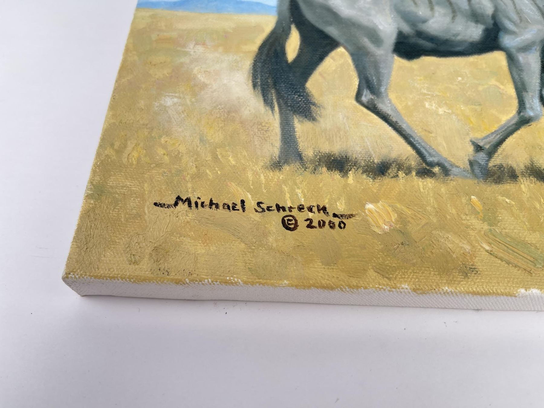 9" by 12" unframed. From Decatur, Alabama, Michael Schreck is a painter of history, sporting, wildlife and portrait subjects with a specialty being scenes from the Civil War and early American frontier such as Custer's Last Stand, and Robert E. Lee with his horse, Traveler. Referring to himself as 'pretty diverse' and 'a historian too', Schreck also depicts many African animals. " 'Hunting and fishing are my inspiration, Schreck said, whether in Africa, the United States or Scotland. There's a self-portrait with a lion among other scenes featuring fly-fishing, canoeing and a decoy carver. And sometimes he adds a bit of nostalgia, such as a 1920s car." In 2000, his quail painting, A Close Call, became the image on the Quail Unlimited Stamp. Other recognition has been selections of his work for print reproduction by Ducks Unlimited and the Alabama Wildlife Federation. Schreck travels extensively throughout America and Africa as well as Europe and South America. He says that Africa, England and Scotland are his favorite places and wherever he goes, he immediately seeks out the animals. Resulting are paintings of wild boar, deer, pheasants, Alpine chamois, and buffaloes, especially The Cape Buffalo, "the most dangerous and vindictive animal in Africa". Michael Shreck is the son of jewelry and belt designer Ann Schreck, also of Decatur, so his influence from childhood was creativity. He credits his mother with much encouragement of his career. Obviously proud of her son, she said: "We realized Mike had a God-given talent when he was small. From the time he could hold a pencil, he was drawing, so we always saw to it that he had drawing and painting supplies." "She recalled his fascination as a child with a print of Custer's Last Stand in his uncle's home. 'Mike would sit and study that for hours, and I still have stacks of Custer's Last Stand drawings and paintings. He's been doing them since he was 5 years old, and he's still doing them."