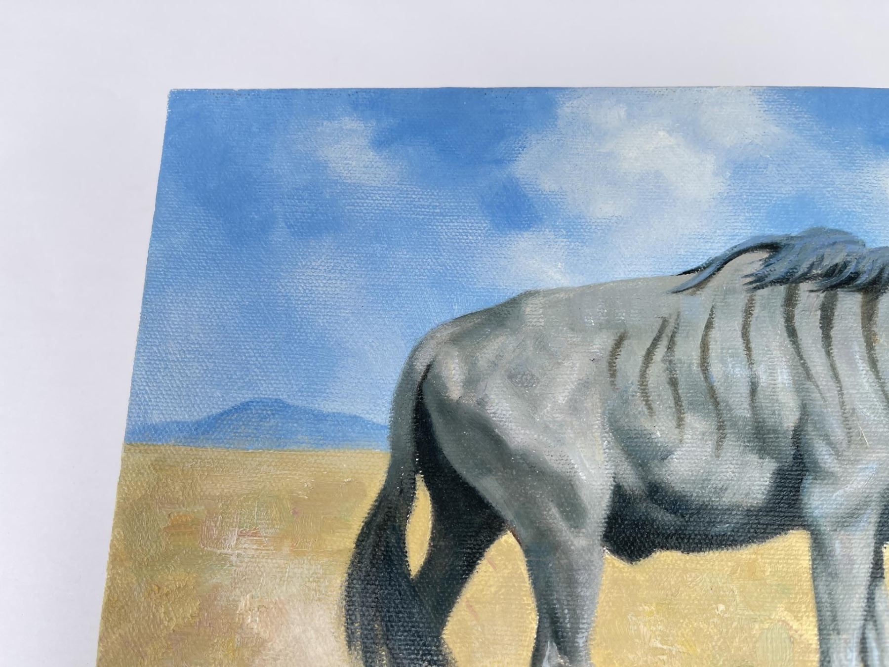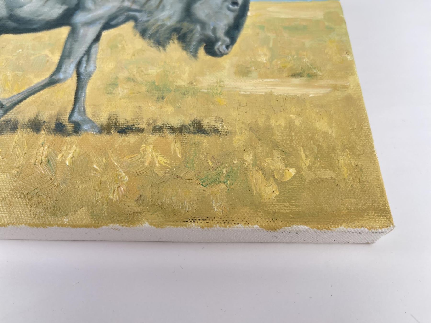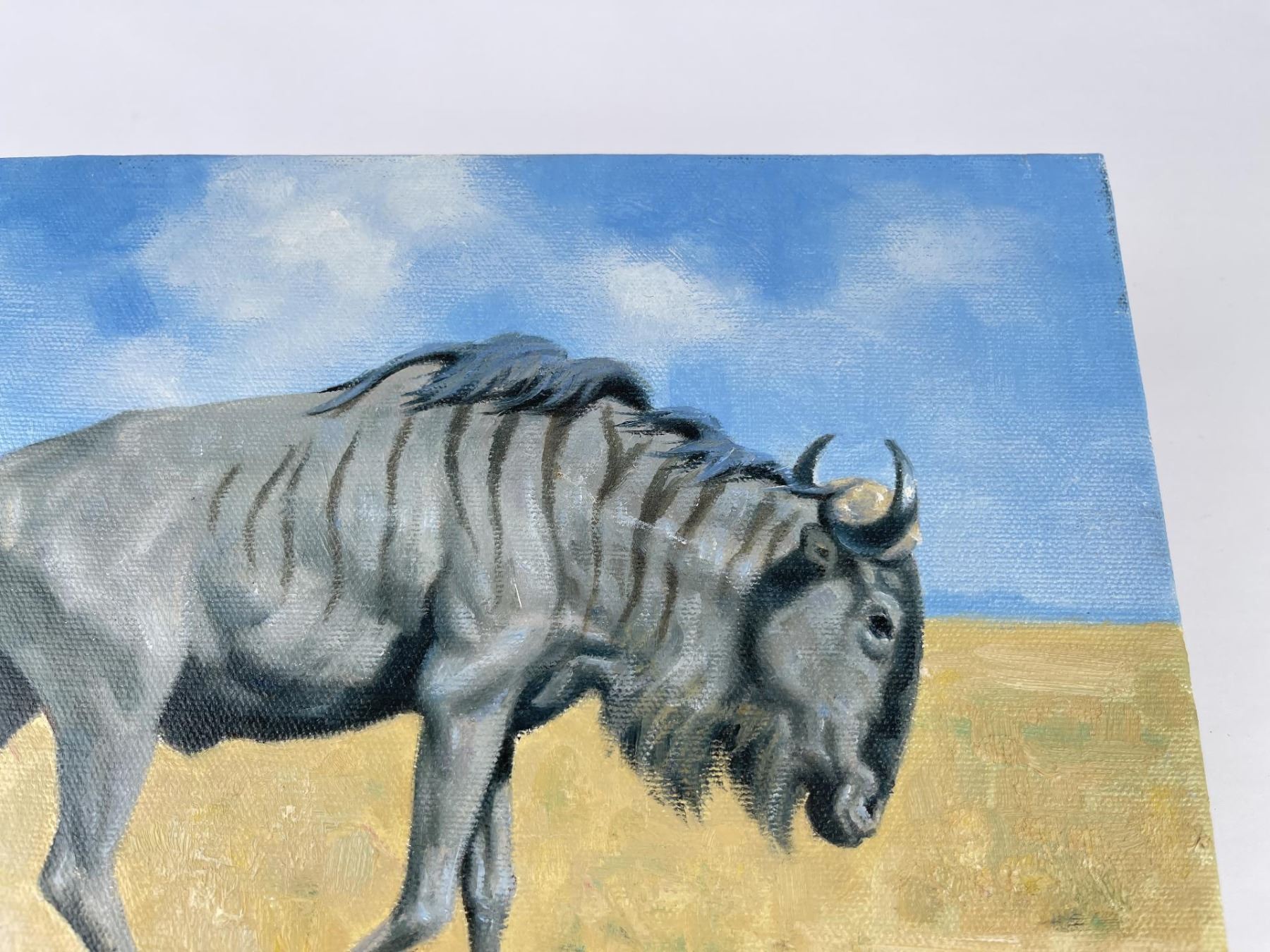 9" by 12" unframed. From Decatur, Alabama, Michael Schreck is a painter of history, sporting, wildlife and portrait subjects with a specialty being scenes from the Civil War and early American frontier such as Custer's Last Stand, and Robert E. Lee with his horse, Traveler. Referring to himself as 'pretty diverse' and 'a historian too', Schreck also depicts many African animals. " 'Hunting and fishing are my inspiration, Schreck said, whether in Africa, the United States or Scotland. There's a self-portrait with a lion among other scenes featuring fly-fishing, canoeing and a decoy carver. And sometimes he adds a bit of nostalgia, such as a 1920s car." In 2000, his quail painting, A Close Call, became the image on the Quail Unlimited Stamp. Other recognition has been selections of his work for print reproduction by Ducks Unlimited and the Alabama Wildlife Federation. Schreck travels extensively throughout America and Africa as well as Europe and South America. He says that Africa, England and Scotland are his favorite places and wherever he goes, he immediately seeks out the animals. Resulting are paintings of wild boar, deer, pheasants, Alpine chamois, and buffaloes, especially The Cape Buffalo, "the most dangerous and vindictive animal in Africa". Michael Shreck is the son of jewelry and belt designer Ann Schreck, also of Decatur, so his influence from childhood was creativity. He credits his mother with much encouragement of his career. Obviously proud of her son, she said: "We realized Mike had a God-given talent when he was small. From the time he could hold a pencil, he was drawing, so we always saw to it that he had drawing and painting supplies." "She recalled his fascination as a child with a print of Custer's Last Stand in his uncle's home. 'Mike would sit and study that for hours, and I still have stacks of Custer's Last Stand drawings and paintings. He's been doing them since he was 5 years old, and he's still doing them."
