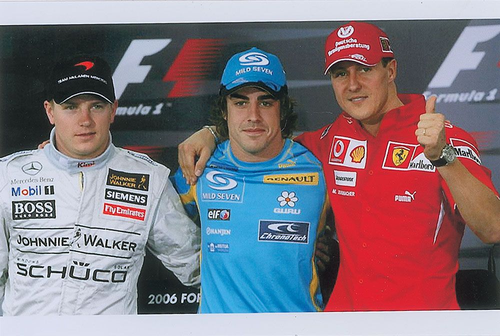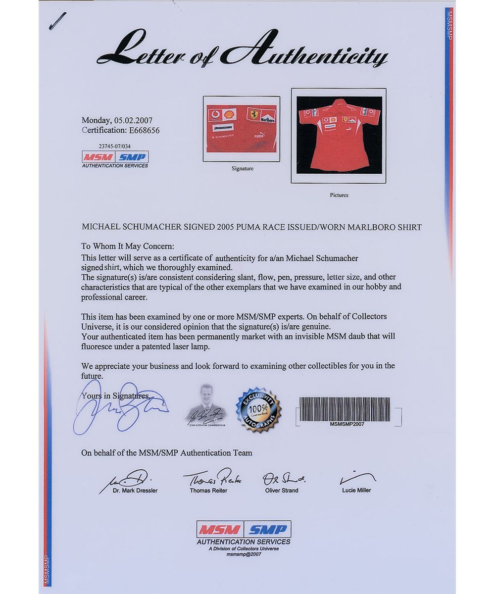 Schumacher’s race-worn official red mesh Puma collared shirt from 2005, size medium, signed on the front pocket in black felt tip. The jersey features patches from sponsors including Ferrari, Marlboro, Vodaphone, Shell, and Bridgestone, and an “M. Schumacher” nameplate affixed to the front with Velcro. In fine condition. Accompanied by a full letter of authenticity from MSM/SMP, and an image of Schumacher wearing the shirt.