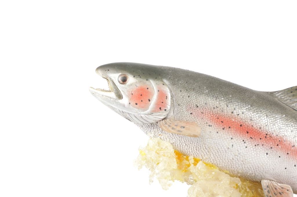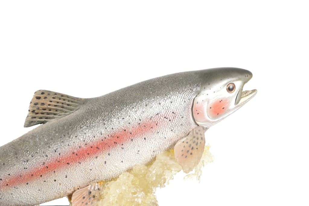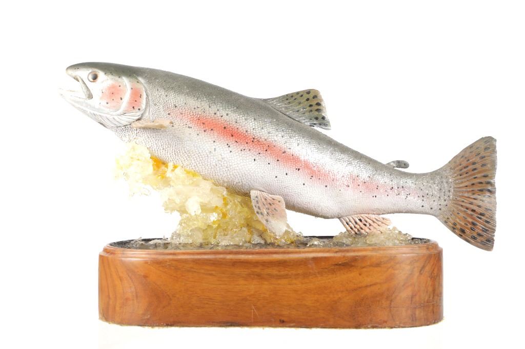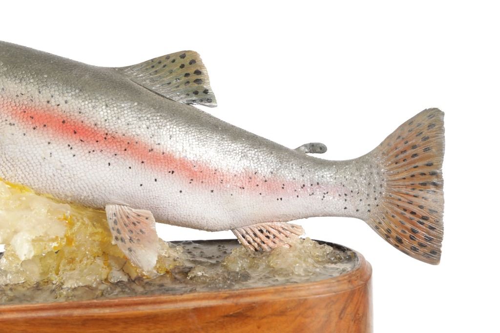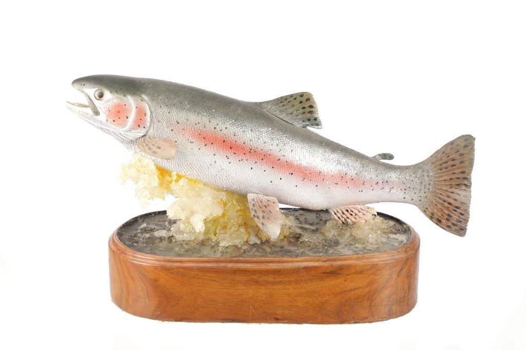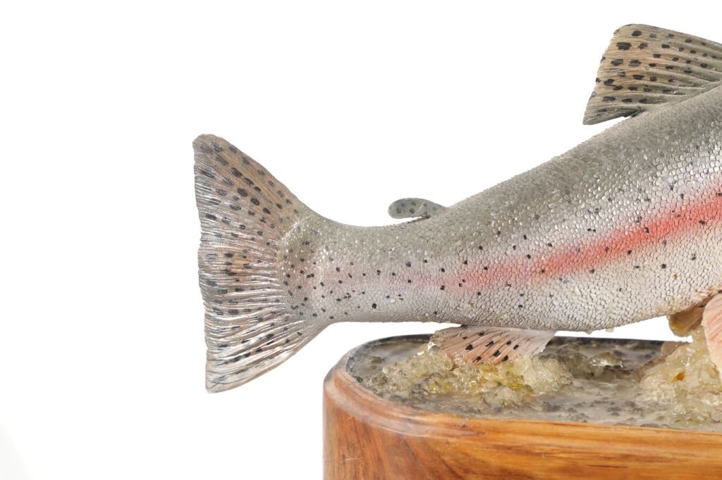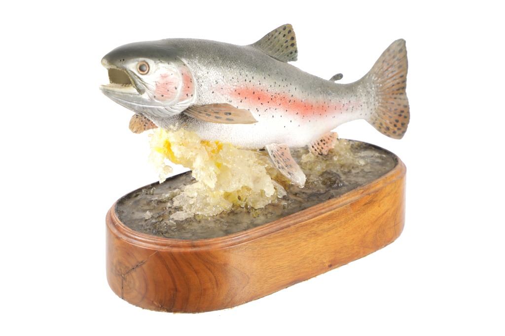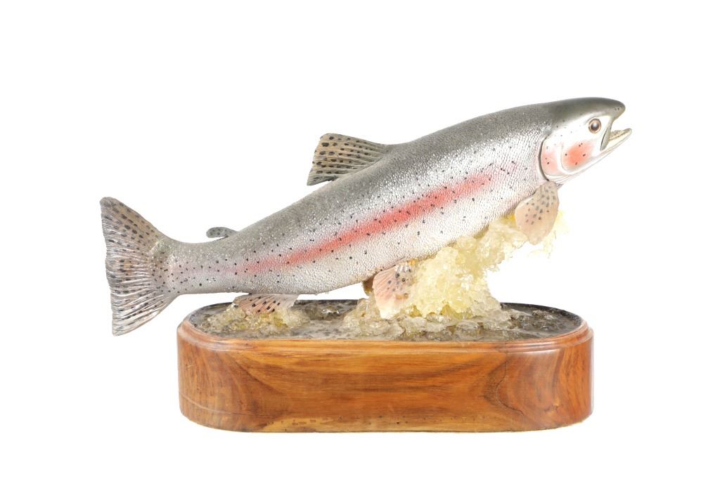 Featured in this lot is this hand carved original jumping rainbow trout by Michael Scott. The rainbow trout features a wonderfully and professionally crafted hand carved wood and celluloid construction that shows hand carved and hand painted decoration with translucent composite or celluloid mimicking water and the action of the trout leaving the water. The trout is mounted on a hard wood base with felt on the bottom. The condition of this of this carved rainbow trout is well preserved with some wear to the paint and the wood body of the fish but otherwise shows a well preserved condition. The measurements of this carved rainbow trout is 12 1/4" x 20 1/2" x 7 3/4". The collective weight of this trout carving is 12lb 12oz.