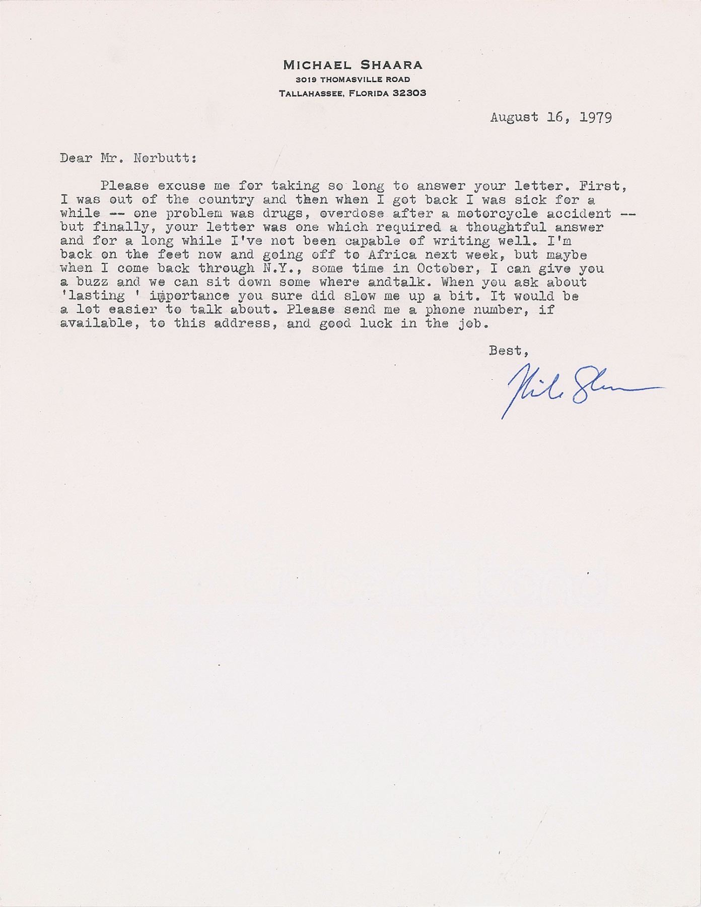 Author of science fiction, sports fiction, and historical fiction (1928-1988) known for his Pulitzer Prize-winning novel about the Battle of Gettysburg, The Killer Angels. TLS, one page, 8.5 x 11, personal letterhead, August 16, 1979. In part: "Please excuse me for taking so long to answer your letter. First, I was out of the country and then when I got back I was sick for a while-one problem was drugs, overdose after a motorcycle accident-but finally, your letter was one which required a thoughtful answer and for a long while I've not been capable of writing well...Maybe when I come back through N.Y., some time in October, I can give you a buzz and we can sit down some where and talk." In fine condition.