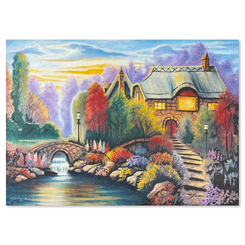 "Becky's Cottage" is a limited edition mixed media on paper by Michael Sharinksi, numbered and hand signed by the artist. Includes Letter of Authenticity. Measures approx. 27" x 19.5" (image).
