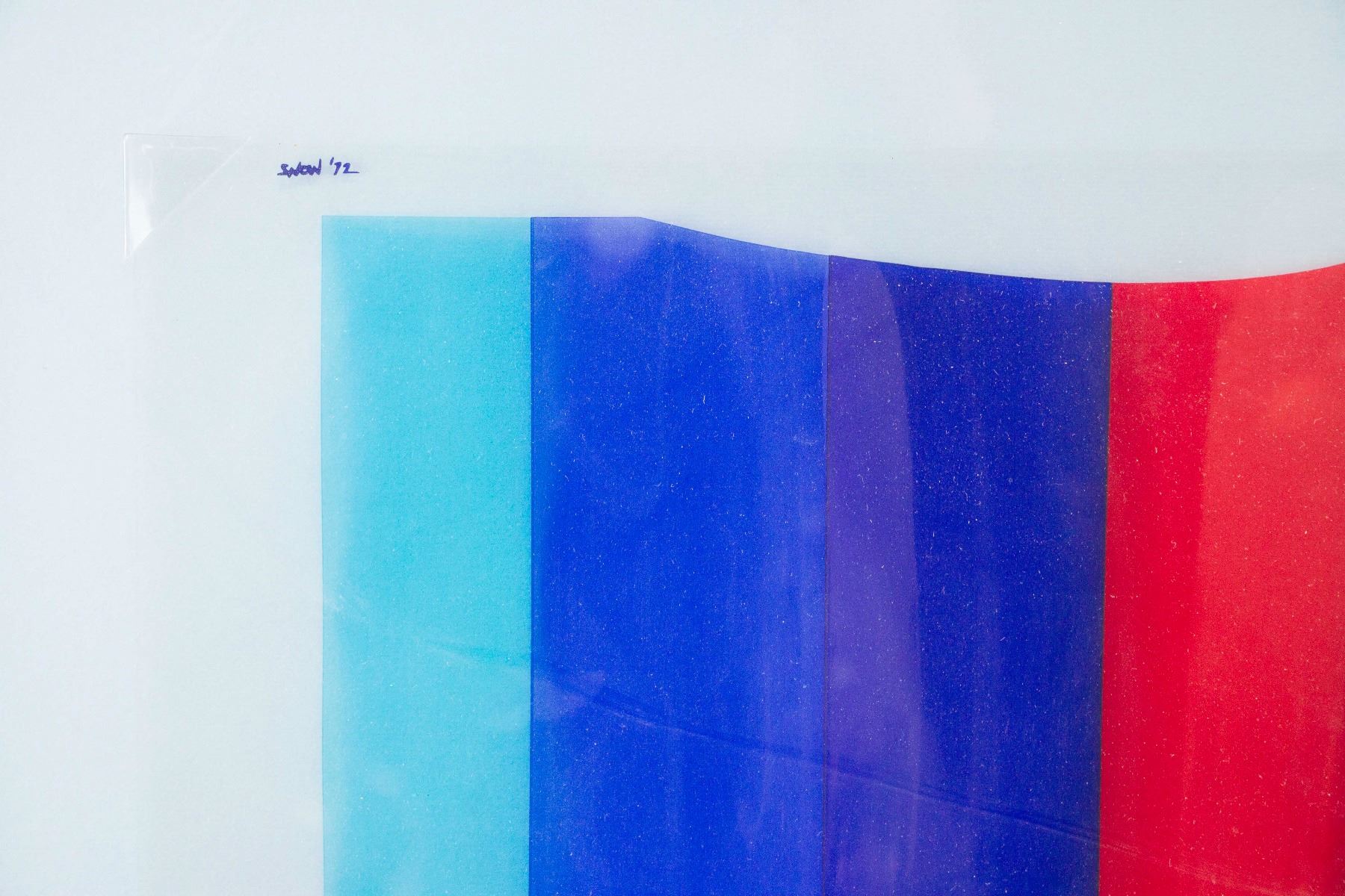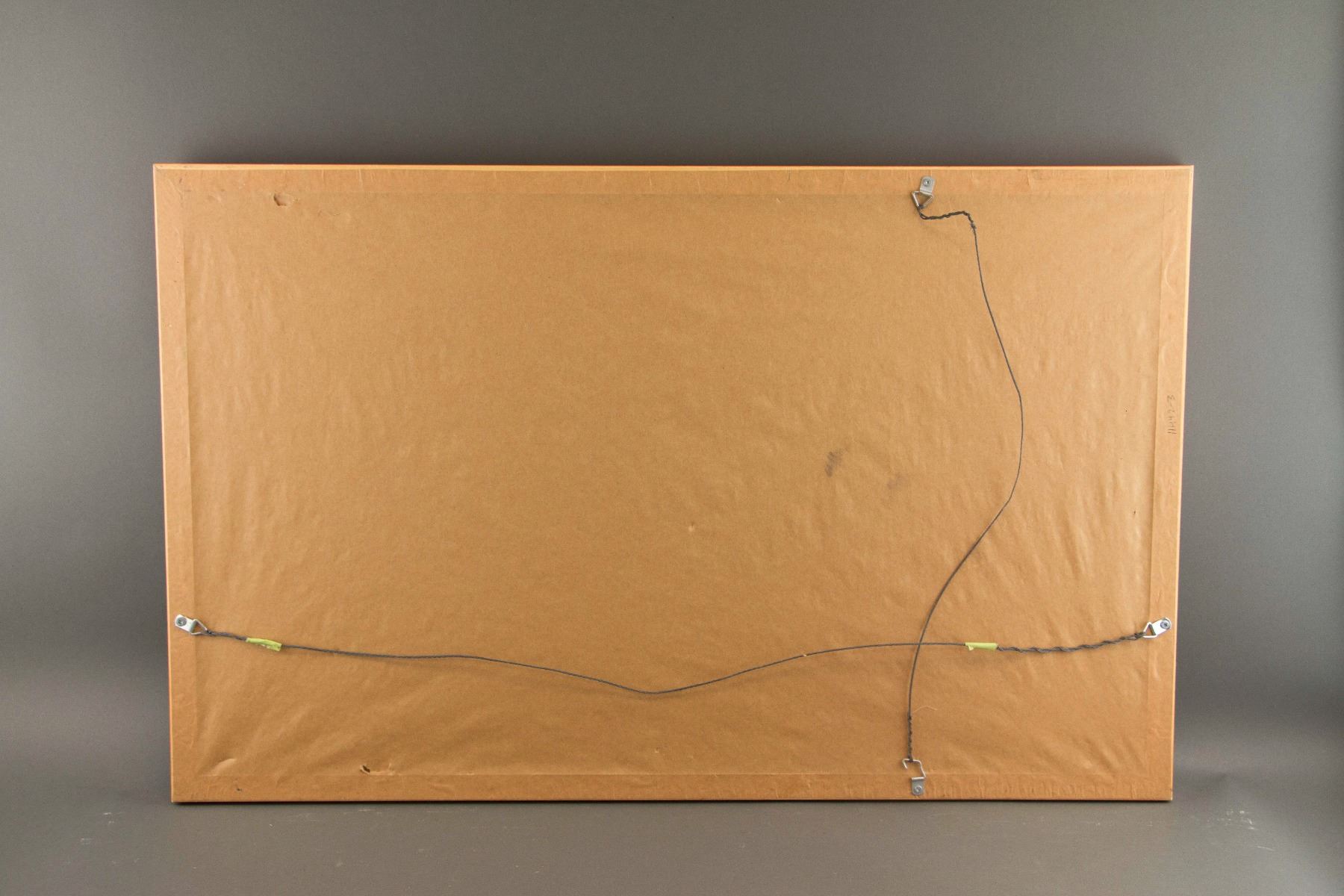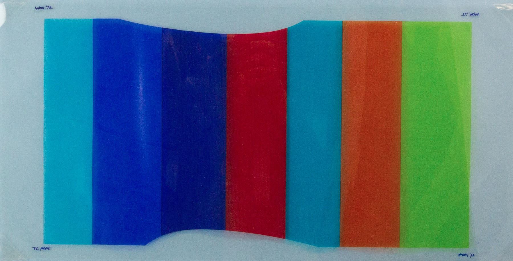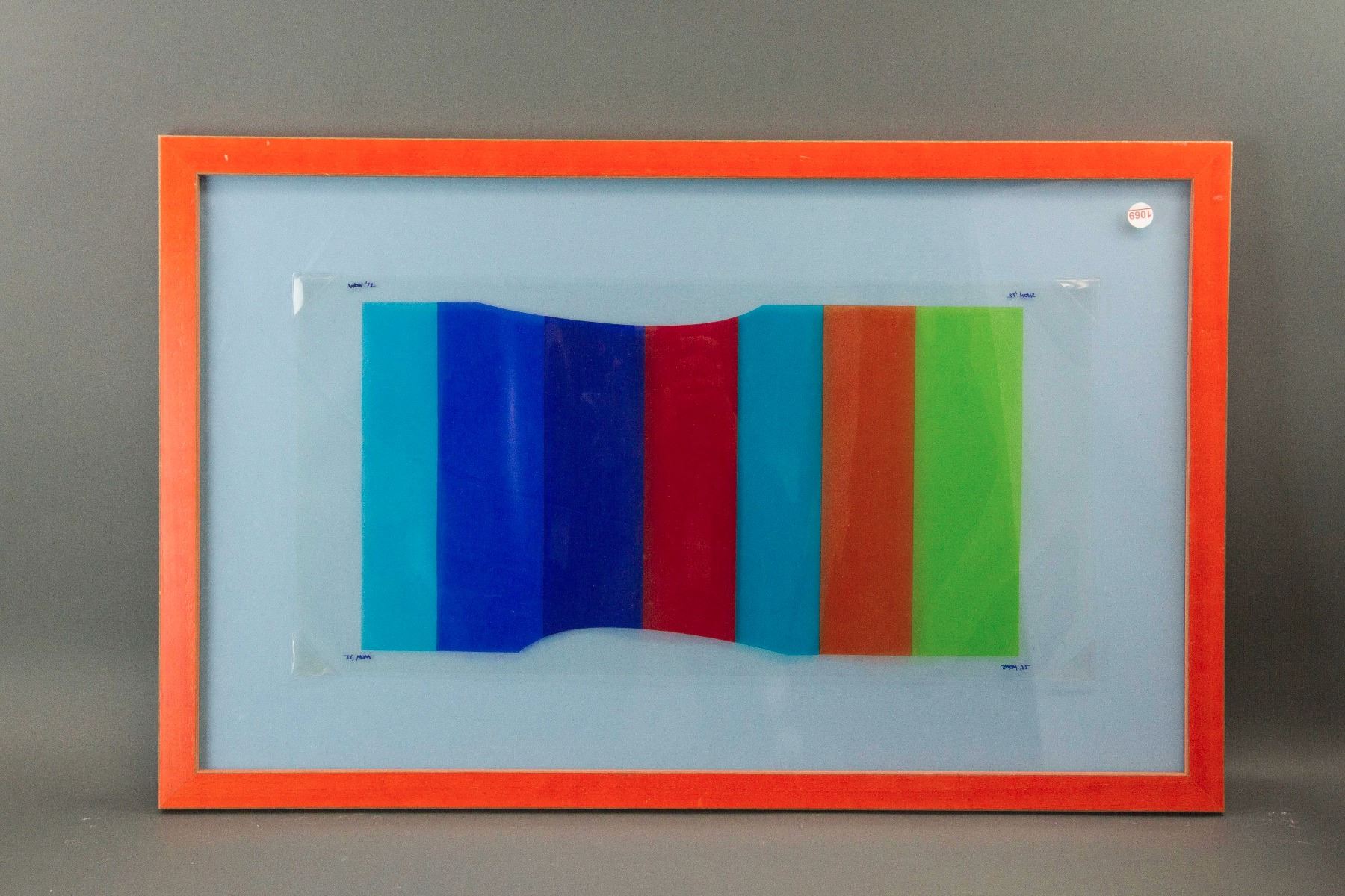 Abstract strips; mixed media of acrylic and plastic; mounted on board with frame; signed Michael Snow (b.1929), Canadian artist; 81 cm x 50 cm with frame