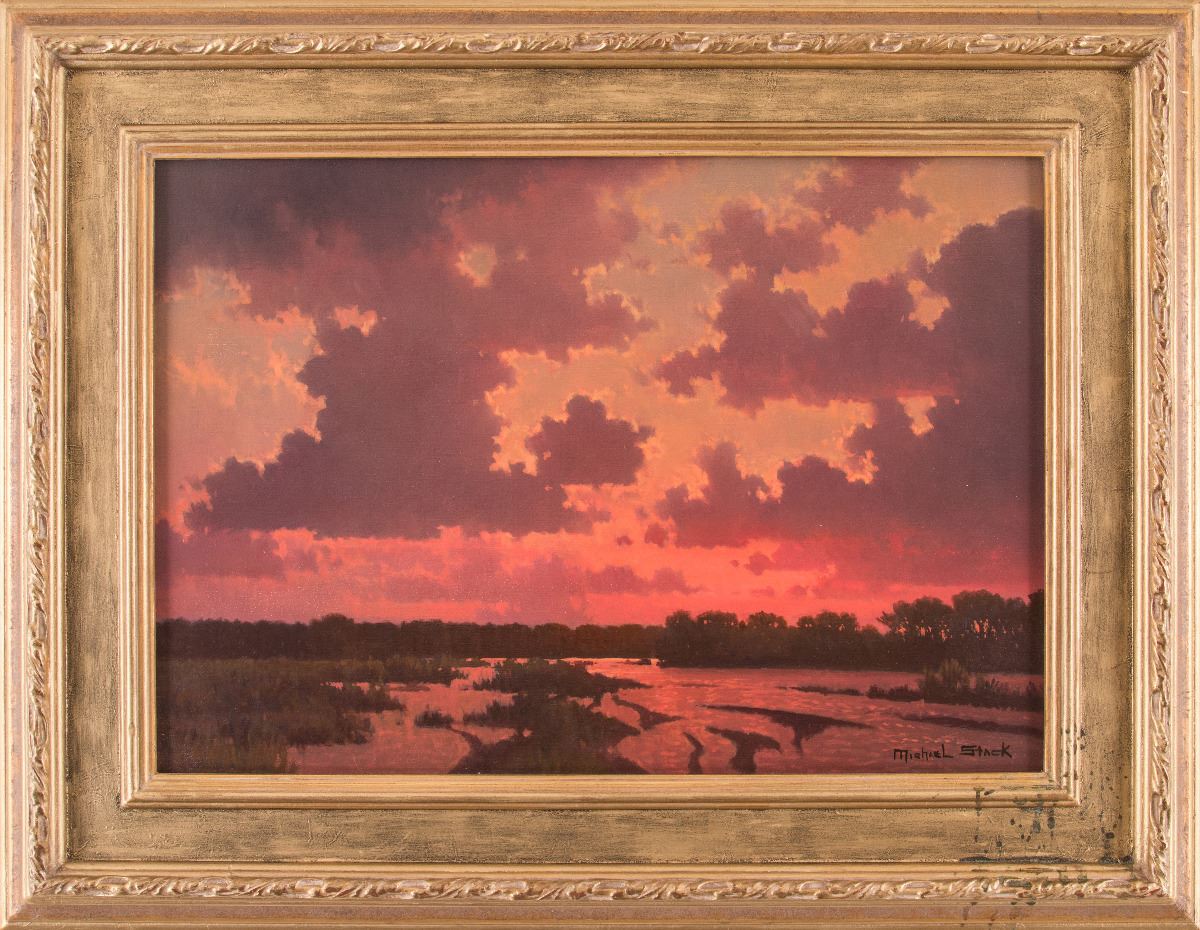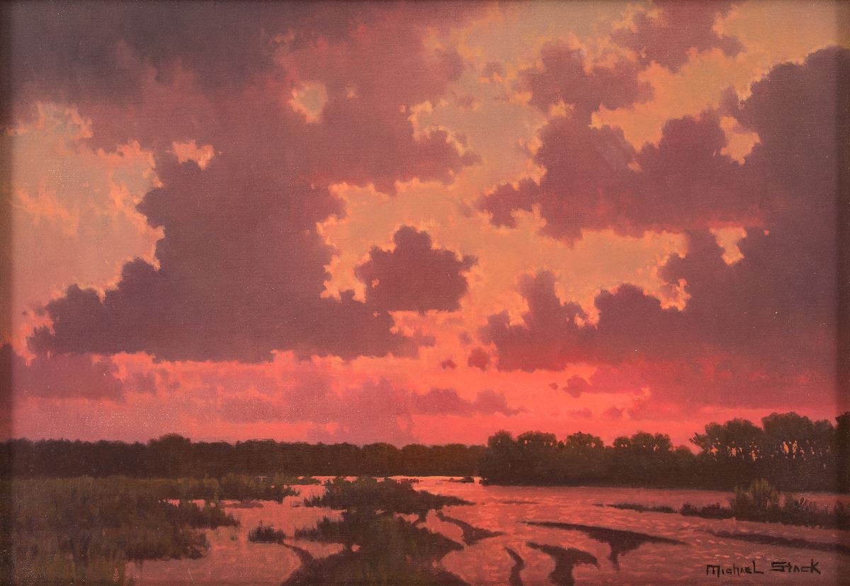 Michael Stack (1947 - ). Red Sky Over Rio Grande. 14" x 20" oil on canvas. Signed lower right. Verso: Titled and dated 2003.
