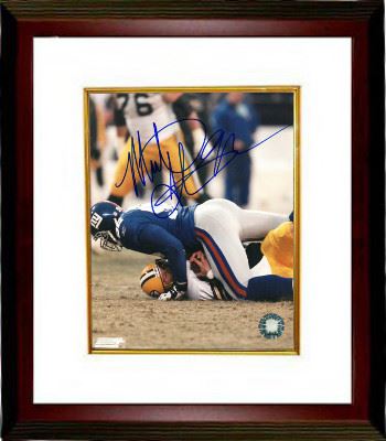 Michael Strahan holds the NFL record for sacks in a single season with 22.5. In the final game of the season on January 6, 2002, with Strahan coming free, Packers quarterback Brett Favre slid down and Strahan fell on top of Favre for an easy sack. After the play, during the ensuing celebration, many of the Giants' defensive players patted Favre on the helmet. At least one observer accused Favre of deliberately falling to ensure that Strahan would get the record.Michael Strahan has hand signed this New York Giants 8X10 Photo. Certificate of Authenticity from Athlon Sports. Custom White Mat and Premium Mahogany Frame as shown.