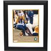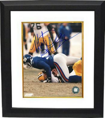 Michael Strahan holds the NFL record for sacks in a single season with 22.5. In the final game of the season on January 6, 2002, with Strahan coming free, Packers quarterback Brett Favre slid down and Strahan fell on top of Favre for an easy sack. After the play, during the ensuing celebration, many of the Giants' defensive players patted Favre on the helmet. At least one observer accused Favre of deliberately falling to ensure that Strahan would get the record.Michael Strahan has hand signed this New York Giants 8X10 Photo. Certificate of Authenticity from Athlon Sports. Custom White Mat and Premium Black Frame as shown.