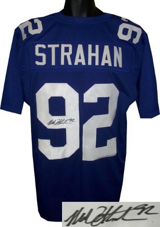 Michael Strahan holds the NFL record for sacks in a single season with 22.5. His 15th and final season proved to be the Giants' best season since 1991. On Sunday February 3, 2008, at the University of Phoenix Stadium in Glendale, Arizona, Strahan had 2 tackles and 1 sack in Super Bowl XLII, in what is considered one of the biggest upsets in NFL history. Michael Strahan has hand signed this New York Giants Blue Prostyle Jersey. JSA Hologram and Certificate of Authenticity.