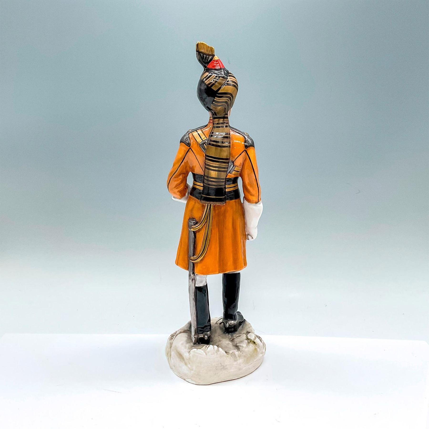 Full title 'Skinner's Horse Officer (1911)' handwritten on the underside. Handmade and hand-painted figure of an officer from the Indian Army holding a metal sword. Black and orange coloration. Michael Sutty backstamp.