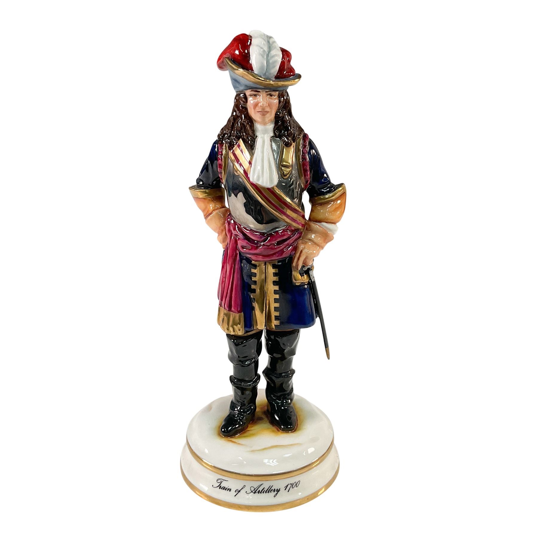 This exceptional Michael Sutty porcelain figurine represents an Officer of the Train of Artillery, circa 1700. Crafted with precision, this figurine showcases the officer in full regalia, featuring intricate detailing on the uniform, vibrant colors, and gilded accents. Mounted on a white circular base inscribed with "Train of Artillery 1700" in gold lettering, this piece exudes historical significance and artistic excellence. Part of a limited edition series, this figurine is number 130 out of only 250 produced. Michael Sutty's reputation for creating fine porcelain military figures makes this a coveted collector's piece. Certificate of Authenticity included. Michael Sutty backstamp.