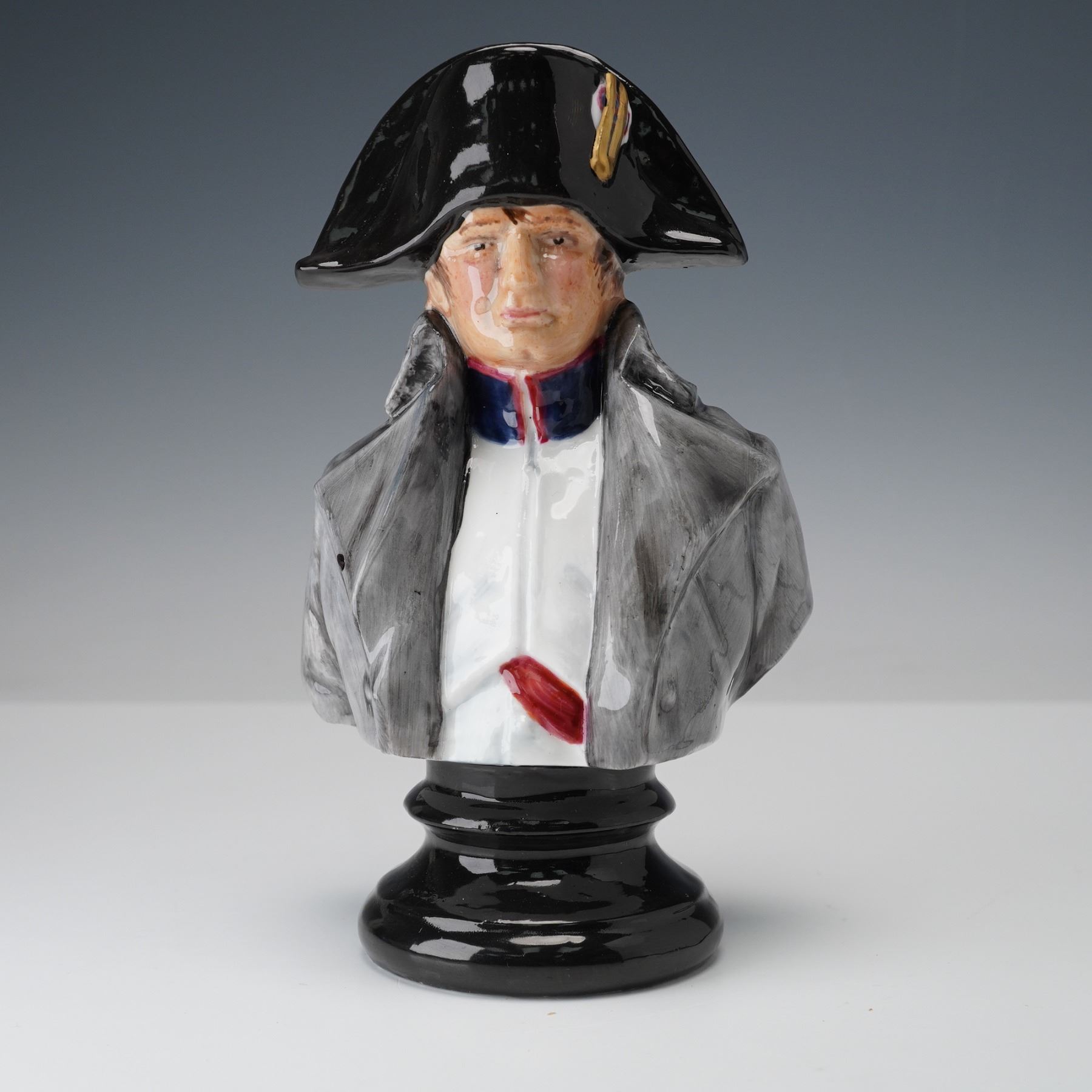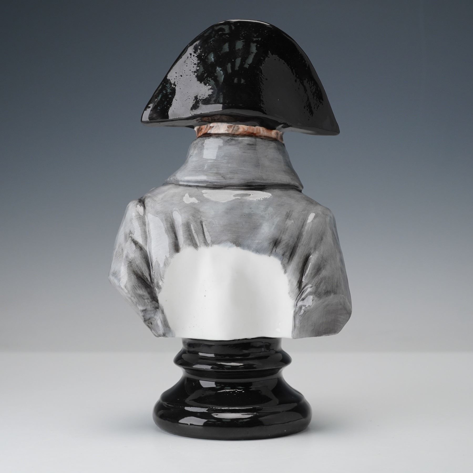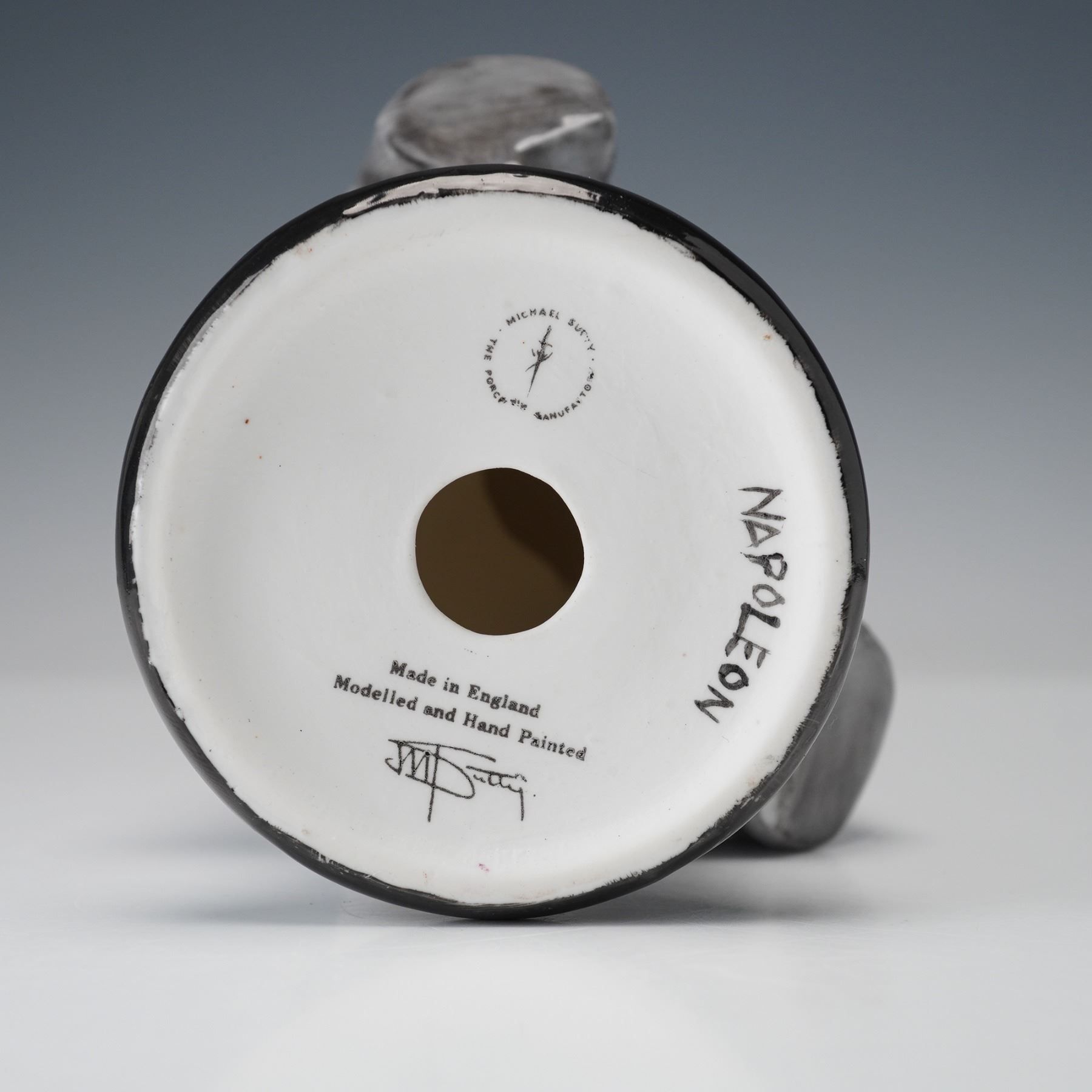The figure is hand-painted with detailed uniform accents and features Napoleon in a gray overcoat, white tunic, and black bicorne hat. The piece is mounted on a black pedestal base. Michael Sutty backstamp featured on the underside.