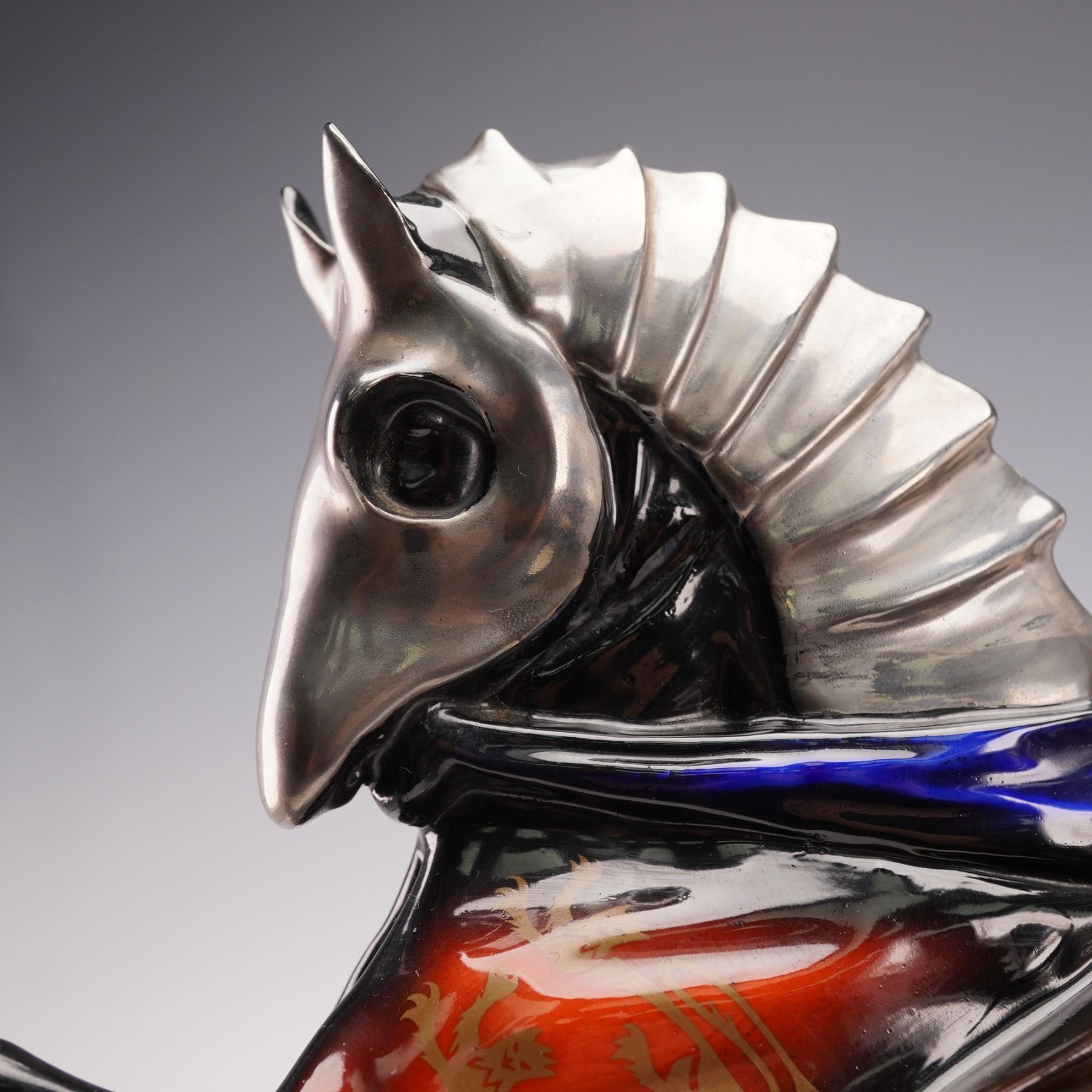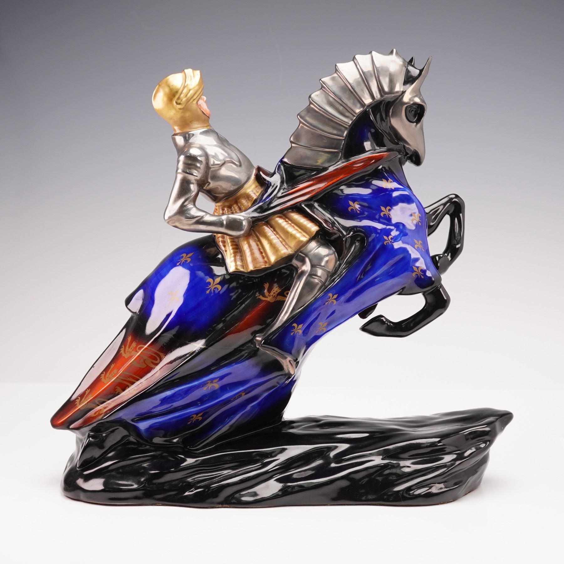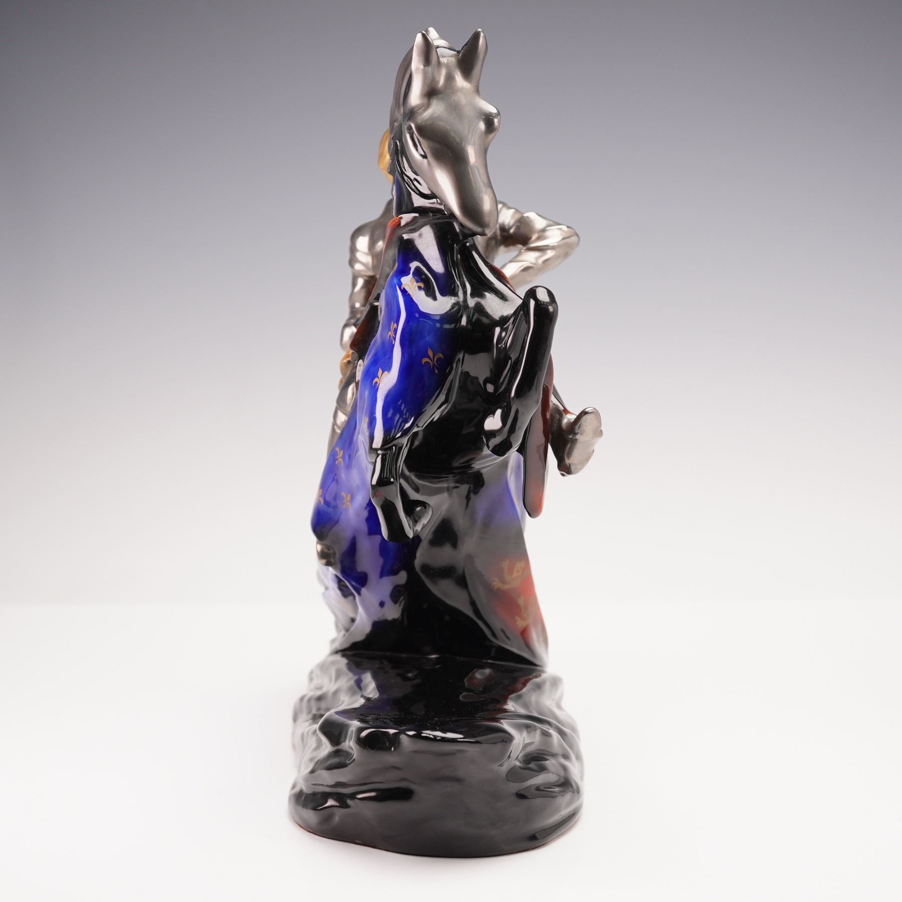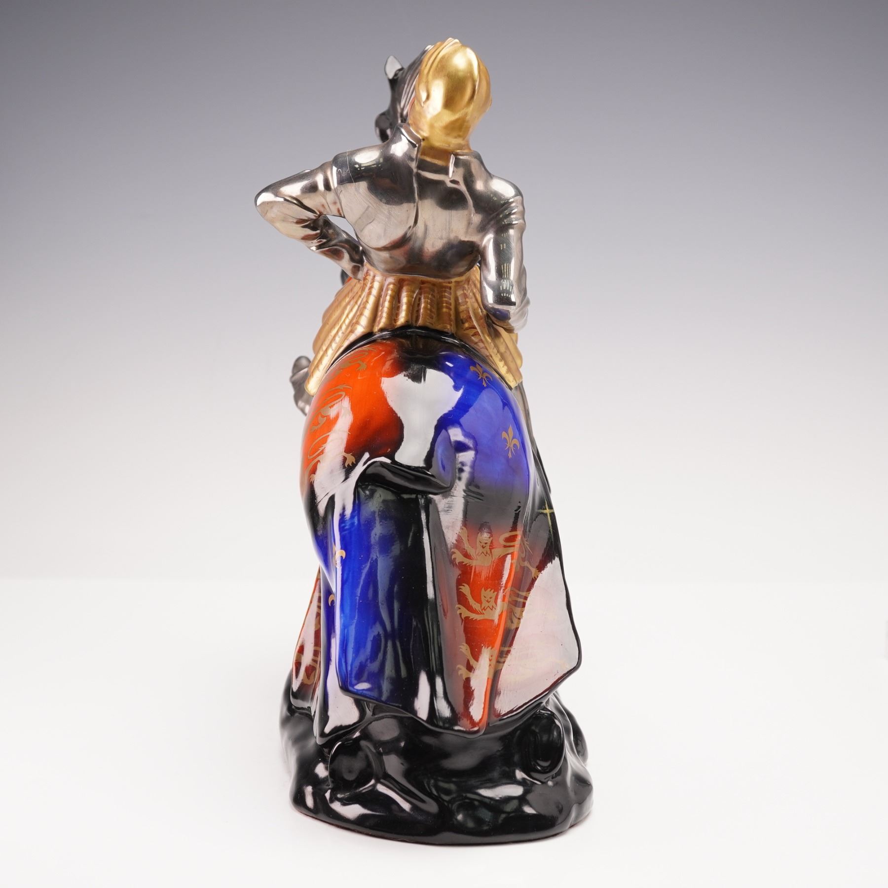Handcrafted and hand-painted porcelain figurine by Michael Sutty depicting Henry VIII, King of England from 1509 to 1547, mounted on a rearing horse in full armor. The piece features detailed metallic silver and gold armor, a vividly painted horse with heraldic red and blue motifs including fleur-de-lis and lion emblems, and a high-gloss finish. Marked on the underside with the Michael Sutty hallmark, production details, and the name Henry VIII. Model number 5.