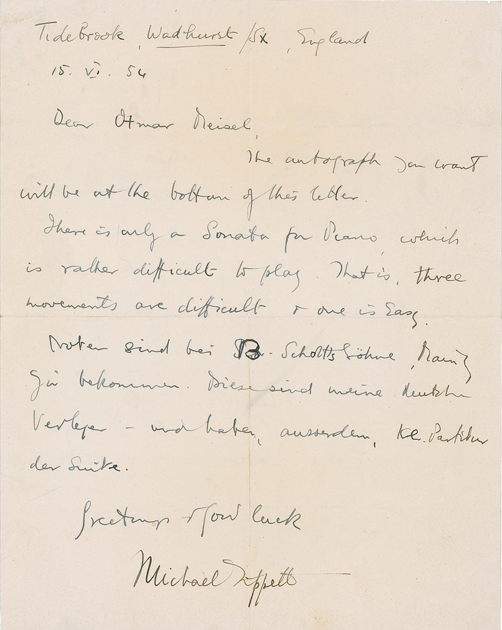 British composer. ALS, one page, 8 x 10, June 15, 1954. Letter to an admirer. In part: “The autograph you want will be at the bottom of this letter. There is only a Sonata for Piano which is rather difficult to play. That is, three movements are difficult and one is easy.” The remainder of the letter is in German. In fine condition, with intersecting folds, one through a single letter of signature, and a light overall shade of toning. Accompanied by the original mailing envelope. RRAuction COA.