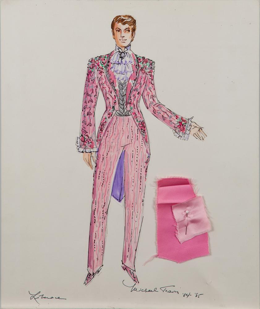 Original costume sketch accomplished in ink and gouache on an approx. 16 in. x 20 in. leaf of artist’s illustration paper, featuring Liberace wearing a flamboyant pink formal ensemble. Hand-annotated by the designer, “Michael Travis,” “Liberace,” and “84-85.” Includes four attached fabric swatches. Acquired from Mr. Michael Travis.