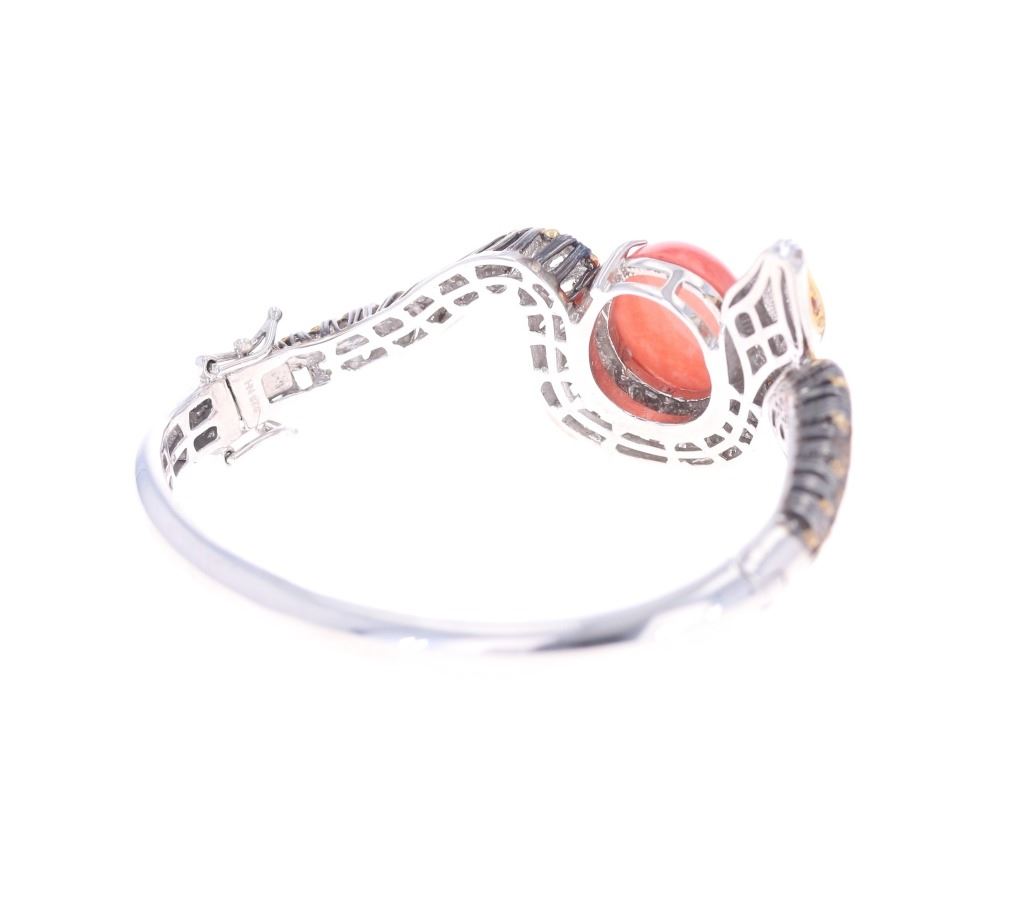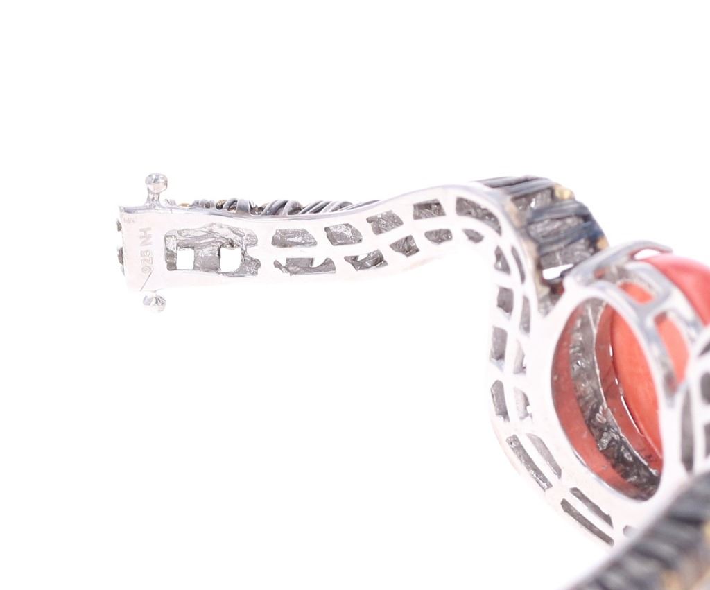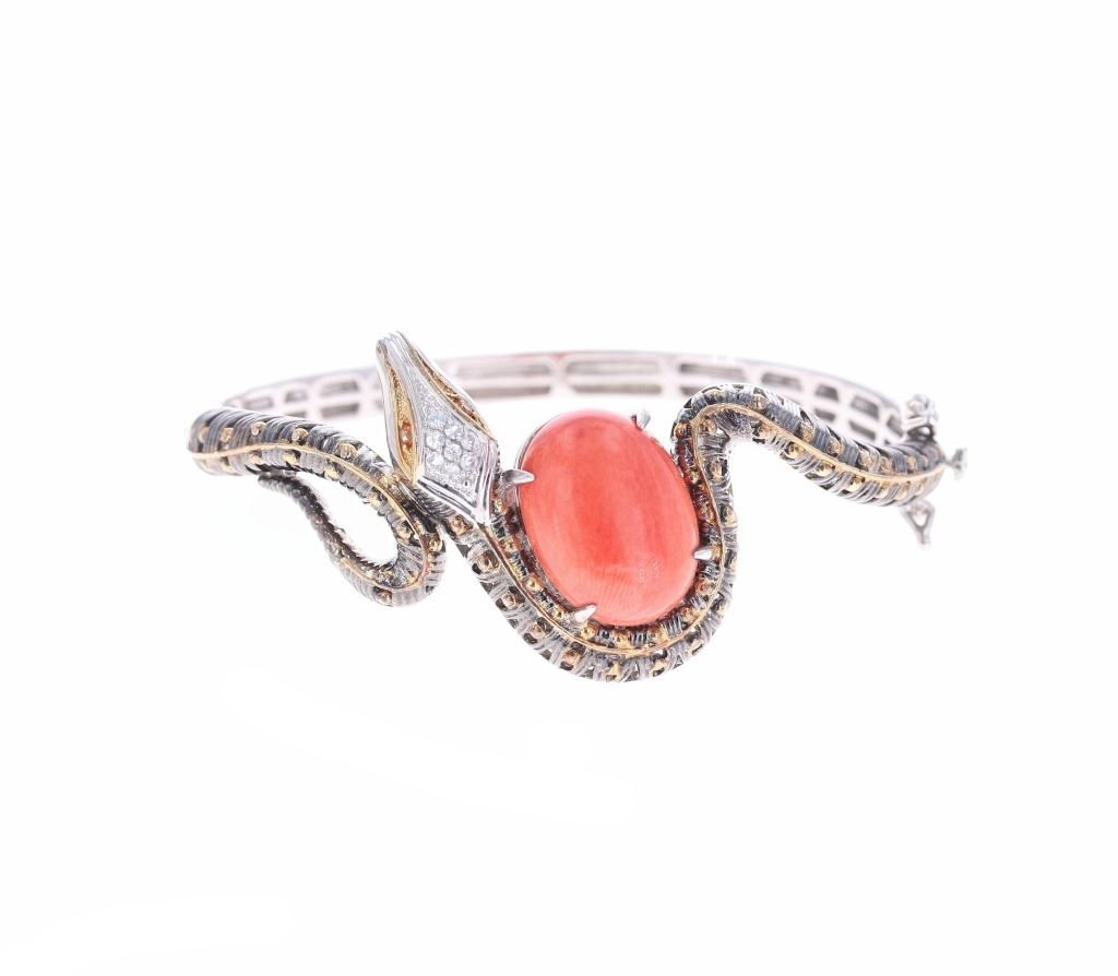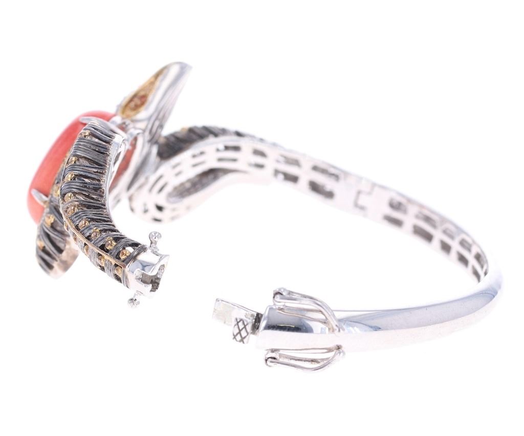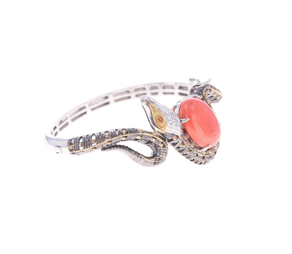 Featured in this lot is this Michael Valitutti sterling Gems en Vogue bracelet. The bracelet features a wonderfully and professionally crafted sterling silver, palladium alloy, Topaz, and spiny oyster construction. The bracelet shows a bangle design with a locking clasp that shows a snake or serpent design with a large spiny oyster cabochon set into the center of the bracelet with palladium alloy accents decorating the serpent; that shows orange and white topaz gemstones for the eyes and adorning the snakes head . The bracelet is marked as follows: .925 - NH. The condition of this Gems En Vogue Collection bracelet is good with no obvious signs of damage and shows good overall condition. The measurements of this 2 1/2" x 2 7/8" and the circumference is 6 1/2". The collective weight of this bracelet is 35.9g.