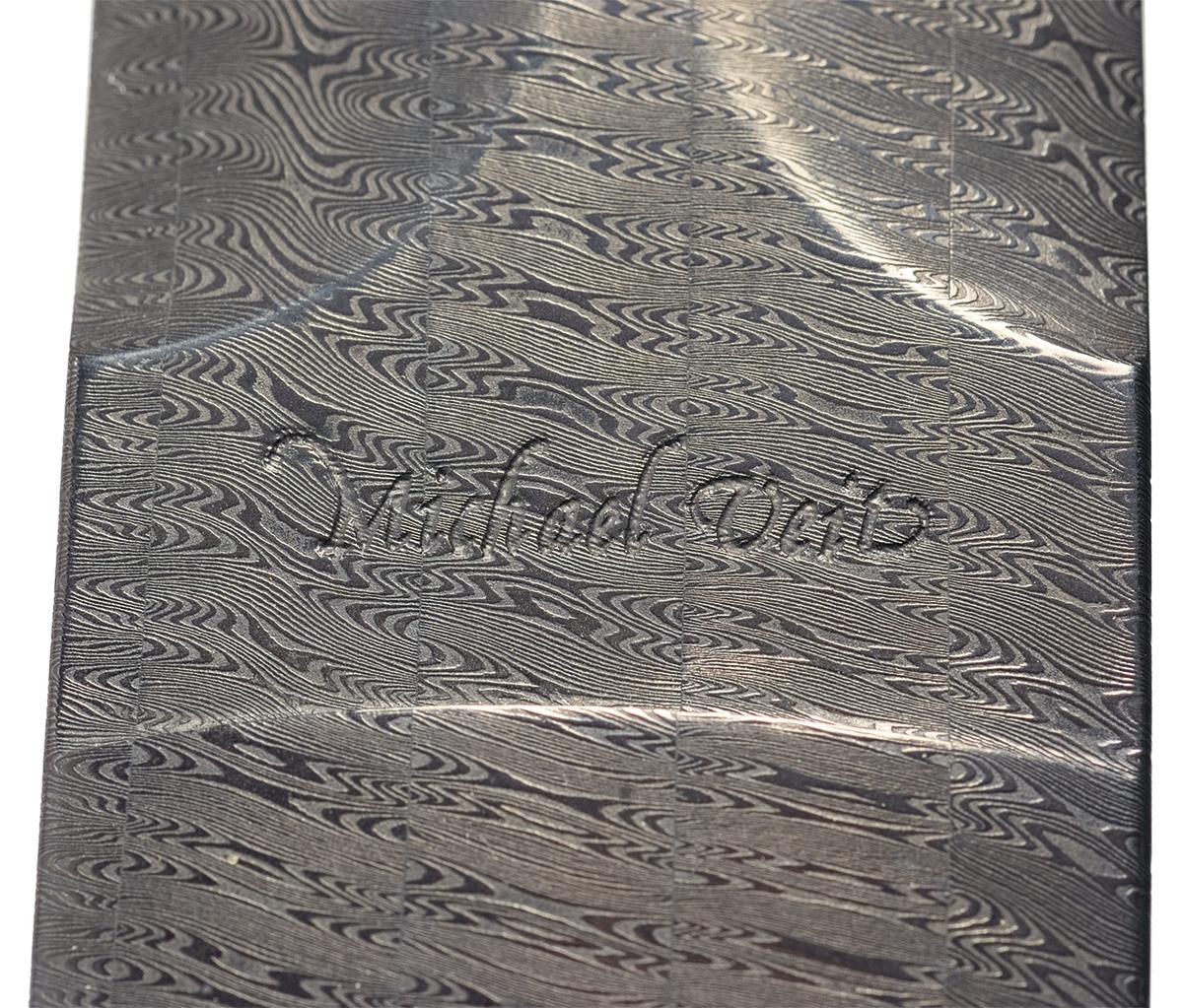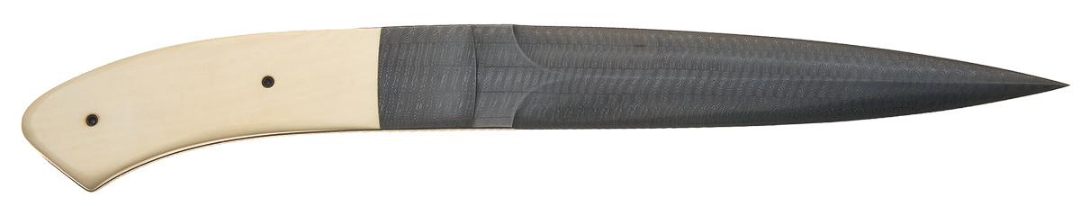 Blade magazine has called Michael Veit, a LaSalle, Illinois, resident, the "Heartland Knifemaker" and states that Veit's knives are "Turkish Damascus delights". This is an example of one of Michael Veit's Damascus knives. The blade and tang are one piece Damascus steel, with the double edged blade measuring 7 inches long and marked "Michael Veit". The knife is fitted with smooth ivory scales secured to the tang with two rivets. OAL: 12 1/4"