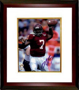 Michael Vick played college football at Virginia Tech, where as a freshman he placed third in the Heisman Trophy balloting. He left after his sophomore year to enter the NFL and was drafted first overall by the Atlanta Falcons in the 2001 NFL Draft and now is the starting quarterback for the Philadelphia Eagles. Michael Vick has hand autographed this Virginia Tech Hokies 8x10 Photo. Vick Hologram, Photo of the Signing and Certificate of Authenticity from Athlon Sports. Custom White Mat and Premium Mahogany Frame as shown