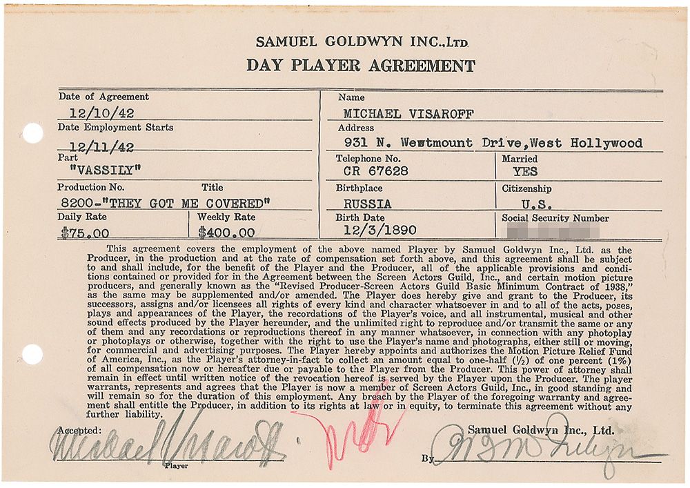 Russian actor (1892–1951) who appeared in over 100 films, most notably as the innkeeper in Dracula. He also appeared in numerous other classic horror films including: Freaks, Murders in the Rue Morgue, and Mark of the Vampire. DS, signed in pencil, one page, 8.5 x 6, December 10, 1942. A Day Player Agreement from Goldwyn Studios in which Visaroff agrees to play the part of Vassily in They Got Me Covered at a daily rate of $75 or weekly rate of $400. In fine condition, with mild creases to the lower left, slightly affecting the signature, toning to the top edge, a red pencil notation to the bottom, and two punch holes to the left side.
