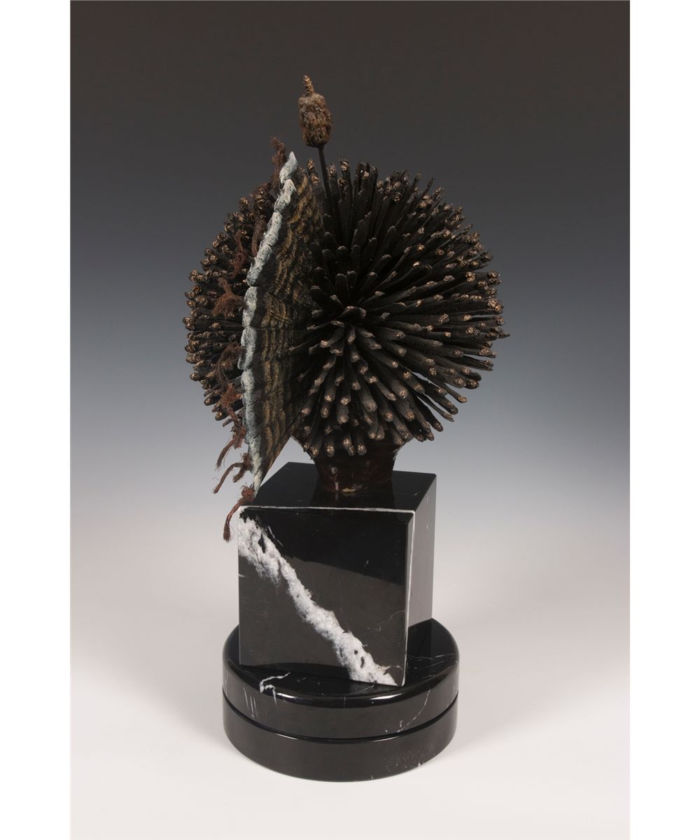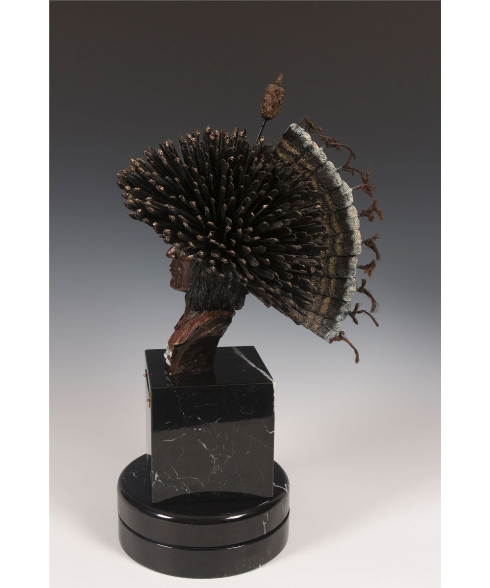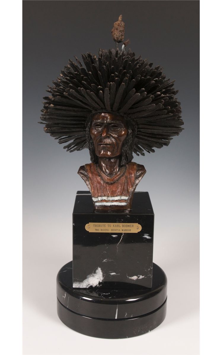 Michael Westergard (20th/21st centuries). Tribute to Karl Bodmer: Two Ravens, Hidatsa Warrior. 12" x 9" x 10" bronze. On a 5" marble pedestal base, atop a 2.75" marble spinning base. Inscribed: WESTERGARD © 90 [ram's head] 13/18. Provenance: Estate of Ken Holm, Denver, CO.