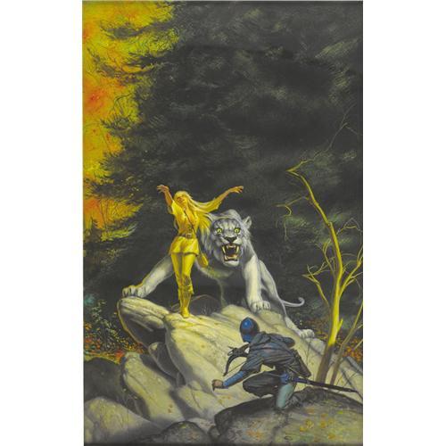 <B>Michael Whelan - "Horn Crown" Paperback Cover Painting Original Art (Daw Books, 1981).</B></I> Michael Whelan is undoubtedly one of the most celebrated science fiction/fantasy artists in history, with fourteen Hugo World Science Fiction and three Howard World Fantasy Awards to his name. This cover scene graced the cover of Andre Norton's novel <B>Horn Crown</B></I> (Daw Books #440). The book was the seminal "Witch World" novel -- the story that told of the first coming of mankind and which established the basis for the entire series -- <B>Horn Crown</B></I> was the key book of the "Witch World" legend. The art measures 18" x 29", and is framed, and in Excellent condition. <BR><BR><B>Important notice:</B> Heritage usually auctions material at the rate of 200-250 lots per hour. On some occasions eBay Live bid software or the Internet may not be able to keep up with the pace of the auction. We recommend placing a realistic absentee bid now as insurance to avoid disappointment. Occasionally the auctioneer may eliminate or reject an eBay Live bid, and the auctioneer may also reopen a lot after the close of the eBay live bidding (usually because we missed an audience bid), and may reject your bid even if it shows you as the winning bidder. By bidding via eBay Live, you agree that Heritage may award the lot to another bidder at its sole discretion under the circumstances described above or any other reasonable circumstances. Since eBay bids are not shown to us until we open the lot on the floor, we treat those bids just like floor bids. In most cases the floor responds before the eBay bid is presented to us, due to Internet lag time, so for consistency we have made it a policy that floor bids are always considered first over tie eBay live bids. Also please note that all Heritage lots purchased through eBay Live carry a 22.5% Buyer's Premium. Please make sure you read the Terms and Conditions before you bid. This lot is being auctioned in conjunction with a live floor auction by Heritage Auction Galleries. All final auction and invoice information will be supplied by Heritage Auction Galleries, and all other information should be considered preliminary. Lot:51623 <BR><BR><B>Winning Notification and Billing:</B> After the FINAL session in this auction is complete, Heritage will send e-mail and snail mail invoices. This process normally takes several days. All final auction and invoice information will be supplied by Heritage Auction Galleries, and all other information should be considered preliminary. <BR><BR>This auction will be conducted on a live auction floor and over the Internet through eBay Live. If you choose to place an absentee bid, please take a moment to <font color='#0000ff'><u><a href='http://pages.ebay.com/liveauctions/help/before/laabsentee.html'>learn how eBay Live absentee bidding works</a></u></font><font color='#000000'>