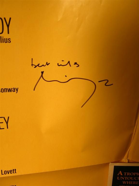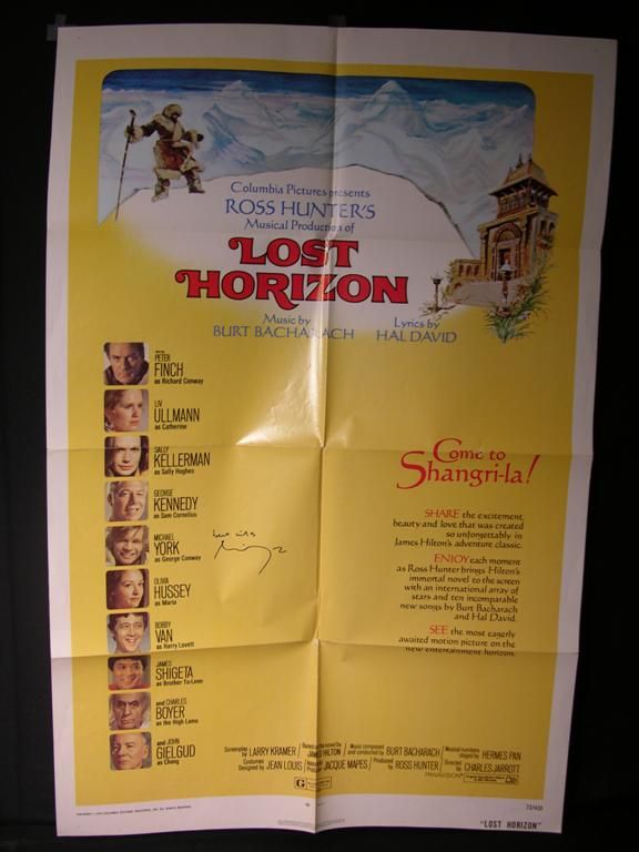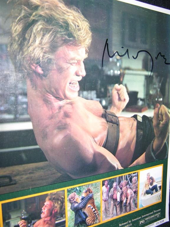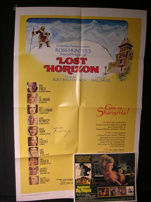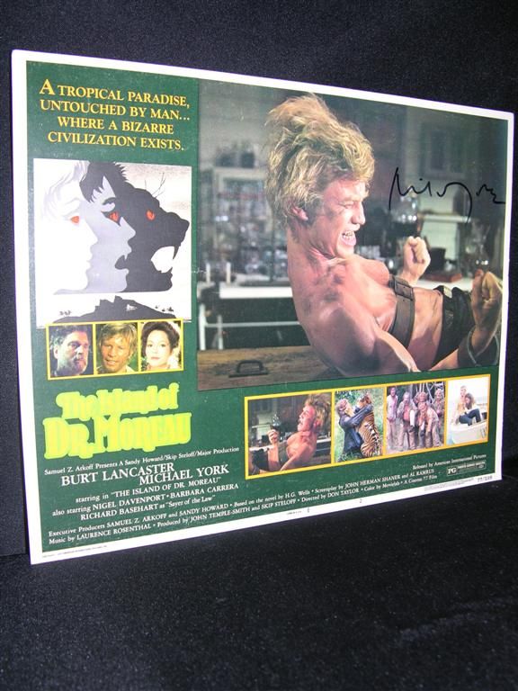 Two items signed by actor Michael York, the first being a lobbycard for the film The Island of Dr. Moreau (1977), depicting York strapped to an operating table and undergoing the metamorphosis from man to monster, and the second being an original one-sheet poster, folded, for the film Lost Horizon (1972). York has signed both in black marker.