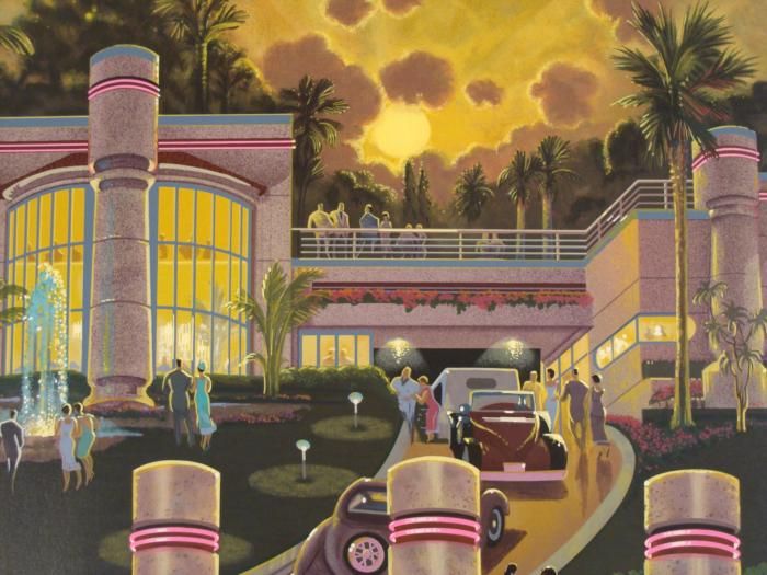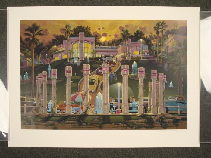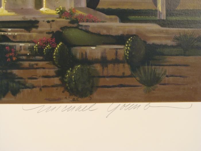 It's only sunset, and already a fabulous party is underway. This lively image lets you feel like you are approaching a grand Art Deco estate. Artist: Michael Young Title: "Sunset Splash" Signature: In pencil, lower right Edition: Numbered from a series of 300 in pencil, lower left Medium: Lithograph on paper Image size: 25" x 38" inches Sheet size: 32 1/4" x 44 1/4 inches Condition: Excellent * Glamour and excitement abound in this glorious print. * Biography * Michael Young began his art studies in Salina, Kansas, and later in New York at the prestigious Art Student's League, which became a training ground for many great artists. He developed a fascination for nightlife and fashions from the past, and combined these into his visual expressions of heightened realism. There is not only style, but a nostalgic quality to his work, paying homage to early to mid 20th century America. His work has appeared in many solo shows, including some in Boston, New York, Beverly Hills, and San Francisco. He has also done commissions for many corporate clients. *