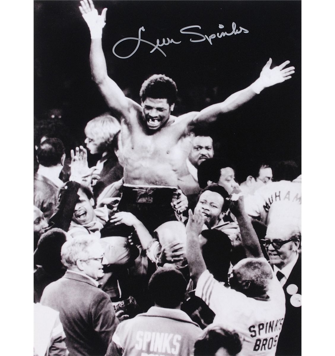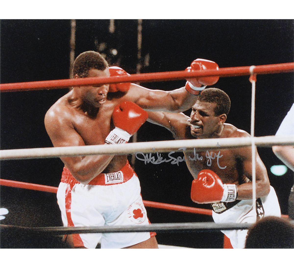 Color satin-finish 14 x 11 photo of Michael Spinks battling Larry Holmes, signed in silver ink; and a satin-finish 12 x 16 photo of Leon Spinks celebrating his victory over Muhammad Ali, also signed in silver ink. In fine condition.