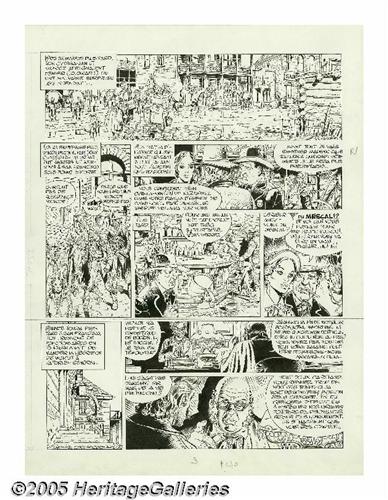 <B>Michel Blanc-Dumont - Jonathan Cartland, page 43 Original Art (undated).</B></I> Michel Blanc-Dumont began his comics career in 1973 with tales of the wild West and Native Americans. He illustrated several Indian legends and his comics career took a leap forward in 1974 when he unveiled the Western series "Jonathan Cartland" (with writer Laurence Harle) in <B>Lucky Luke</B></I> Magazine. The series was later continued in <B>Pilote</B></I> and <B>Charlie Mensuel</B></I>. Blanc-Dumont's illustrations were collected in the Darguad album <B>L'Univers de Blanc-Dumont</B></I> in 1984, This highly detailed page has an image area of 12" x 16". The page was long the border of the bottom panel tier and the upper tiers and the pieces have since been rejoined; otherwise the art is in Excellent condition.