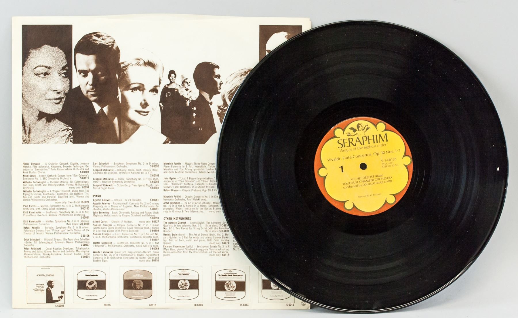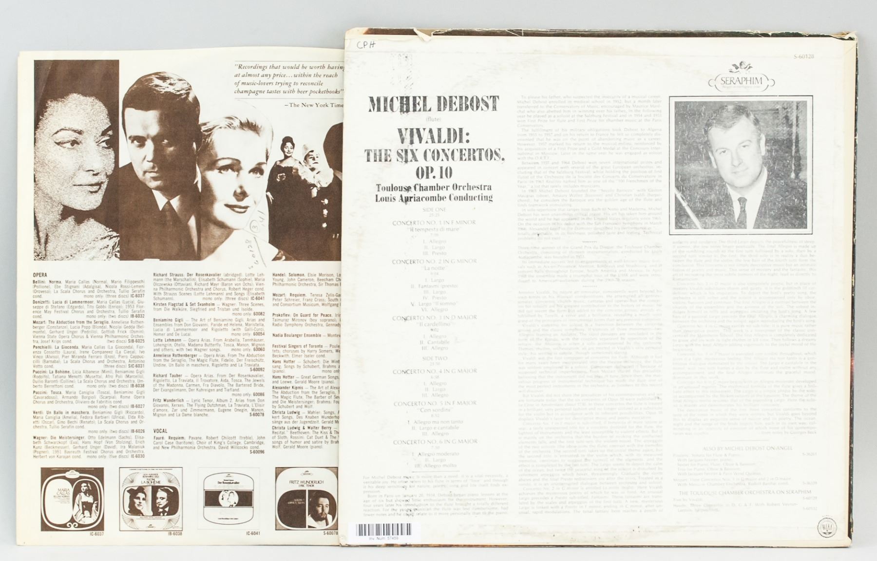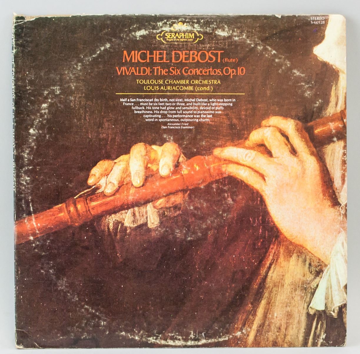 Vinyl disc titled "Vivaldi: The Six Concertos, Op. 10", featuring Michel Debost on the flute. Includes slipcover. 30 x 30 cm (12 x 12 in). May have scratches or blemishes on surface.