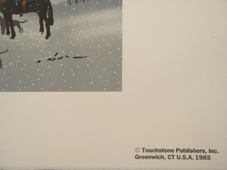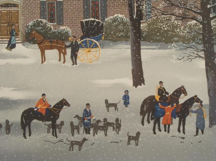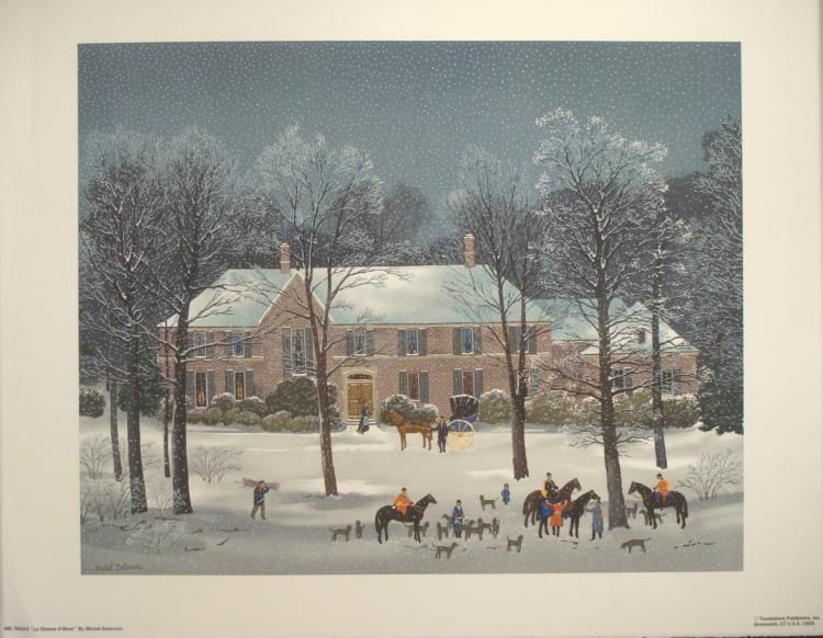 This is a winter hunting scene, with hunters and their hounds preparing for the hunt.Artist: Michel Delacroix * Signature: In the plate * Title: "Chasse d'Hiver" * Medium: Print on rag paperSheet Size: 23 x 30 inchesPublisher: Touchstone PublishersEdition: Out of printCondition: Excellent * Biography: French Artist Michel Delacroix is well known throughout the world as a master of the naif tradition. He paints Paris as he saw it as a child of seven whom was spared grasping the horror of war. This idyllic outlook of the city he calls "one of the great adventures of my life". Delacroix's work has been featured in over 275 one-person shows in the U.S. from coast to coast. He has shown his work in Europe and Asia, and his pieces are found in the permanent collections of the Musee International d'Art Naif, and the Foundation Max Fourny in Paris. In 1995, he was named the Official Artist for the 1995 Special Olympics World Games. *