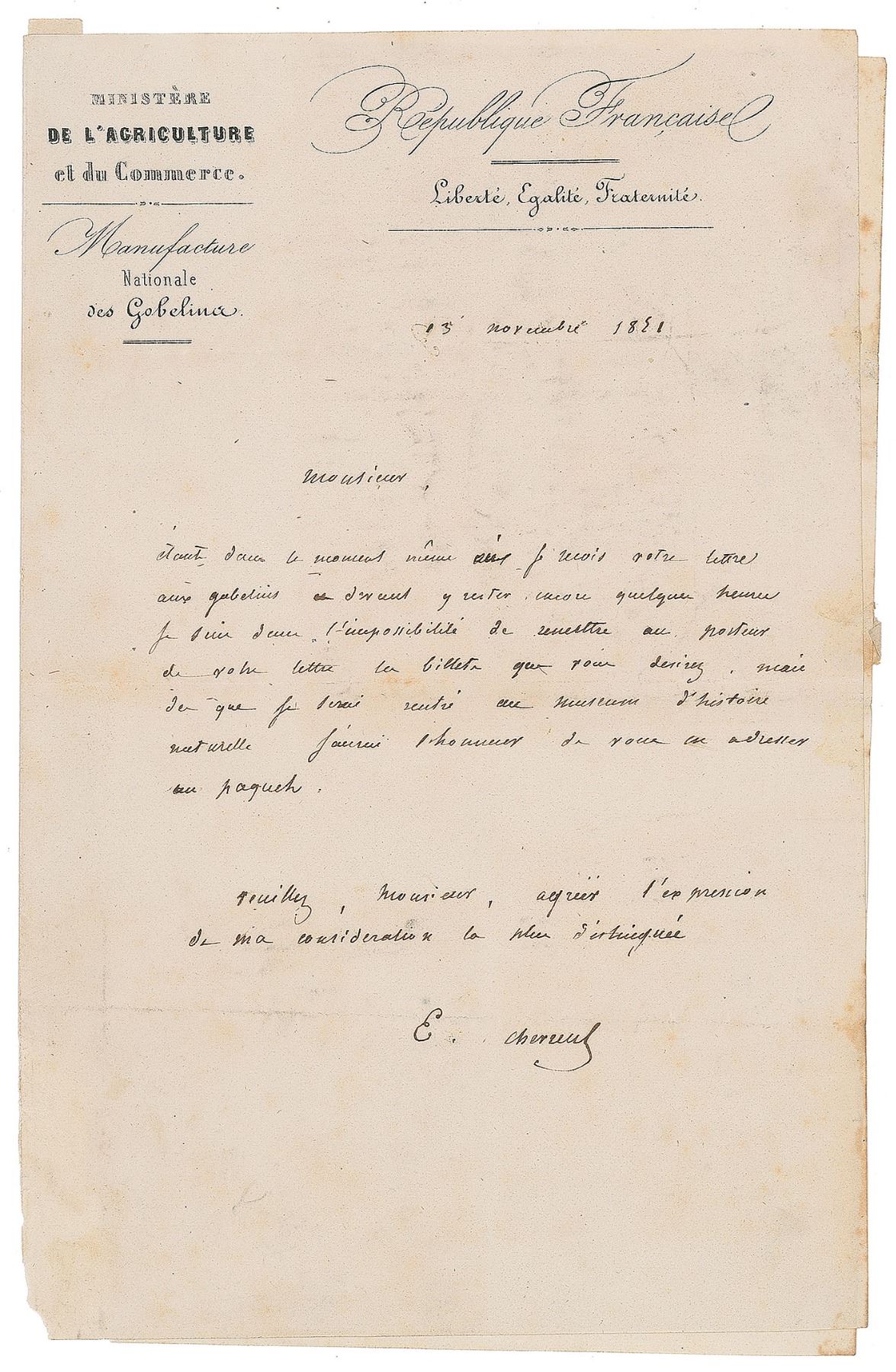 French chemist (1786–1889) known for his work with fatty acids, who is credited with the discovery of margaric acid, creatine, and designing an early form of soap made from animal fats and salt. Untranslated ALS in French, signed “E. Chevreul,” one page, 5.25 x 8.25, Ministere de l'Agriculture et du Commerce letterhead, November 13, 1871. In fine condition, with scattered light foxing, and an old mounting strip and some paper loss to the integral blank sheet.