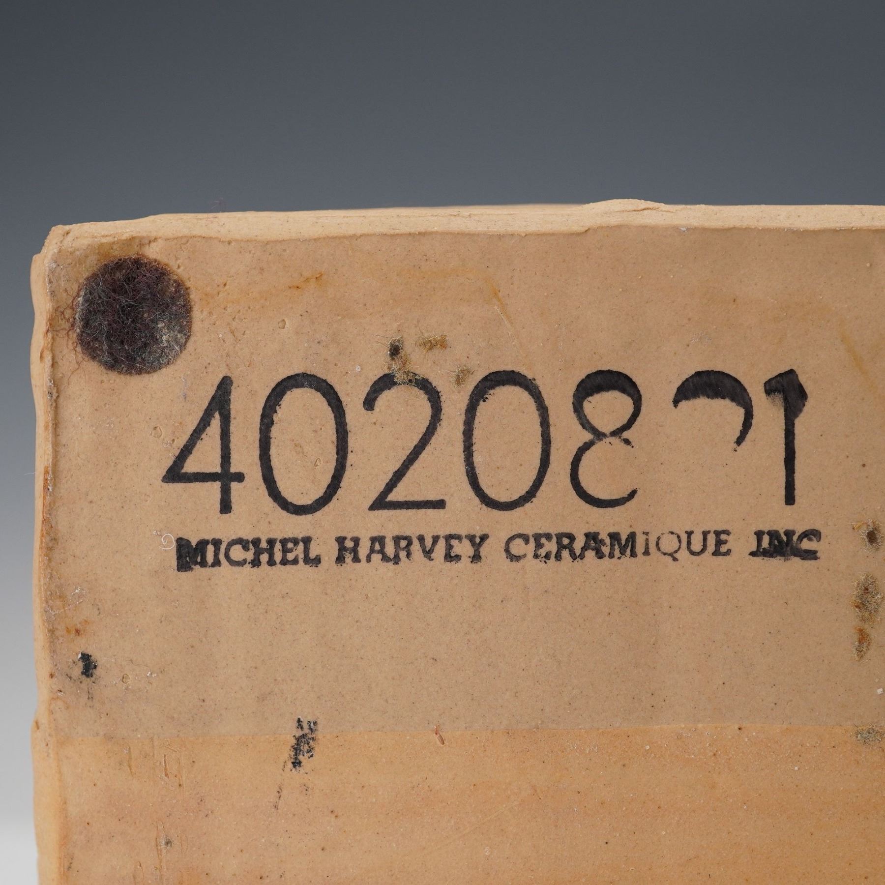 A slip-cast ceramic box incorporating glazed banding, ink-stamped decoration, and applied steel staples. Michel Harvey Ceramique Inc. backstamp.