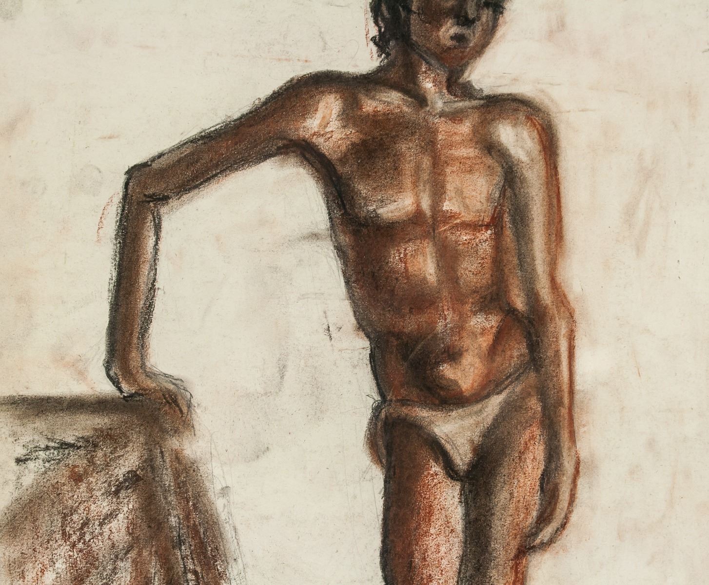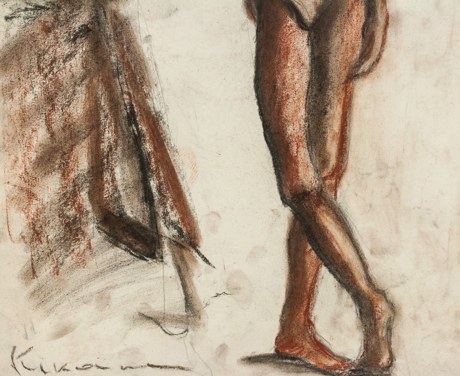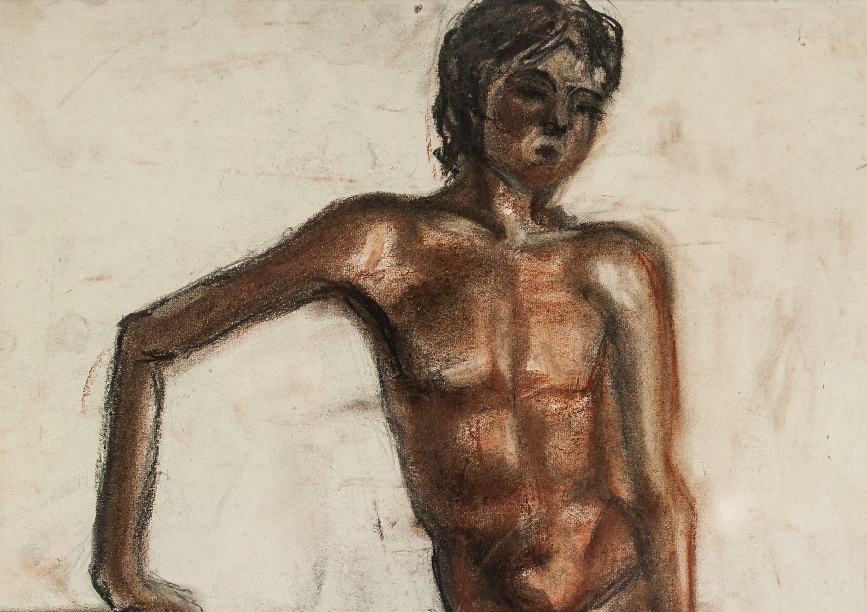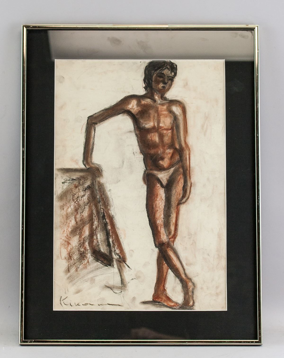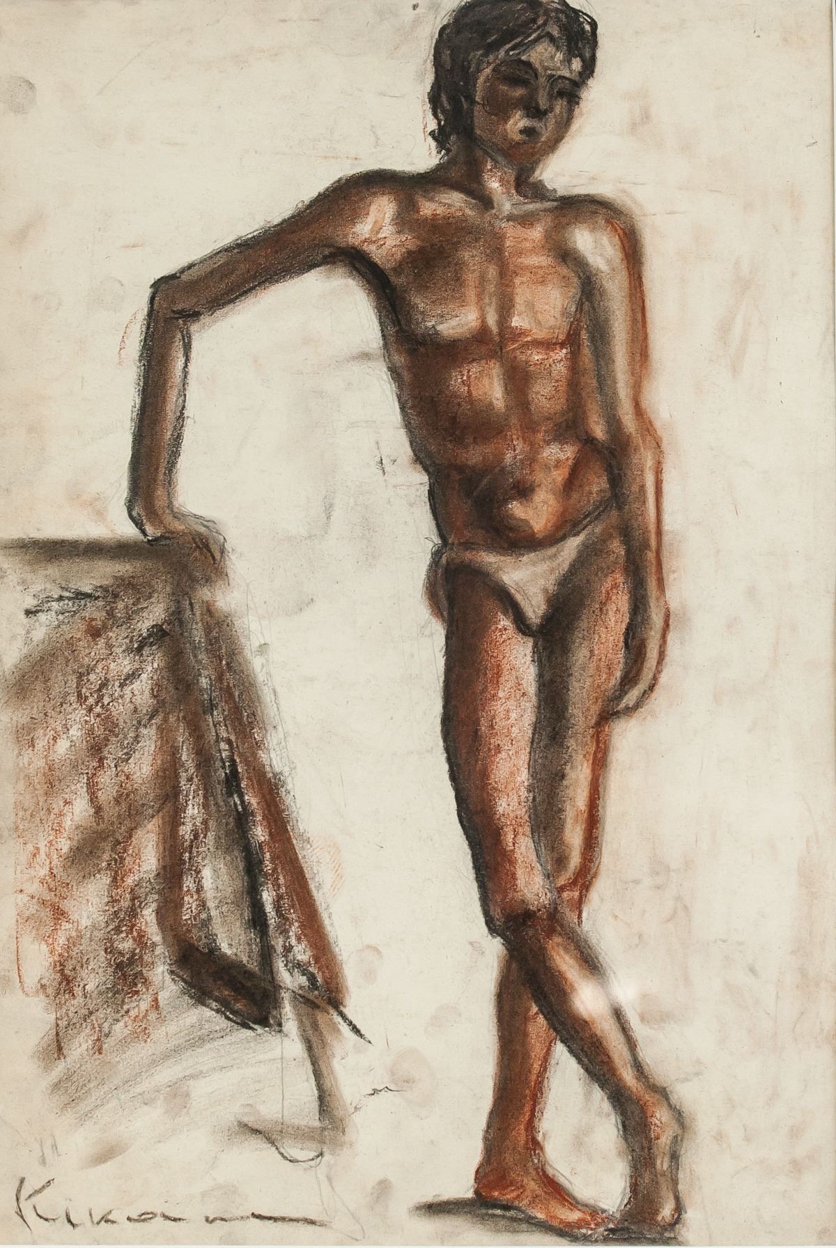 Pastel on paper, framed. Featuring a portrait of a man in his undergarments. Signed Kikoine on the lower left corner. On verso label inscribed Galeries Place Royale. Visible signs of water damage on verso. Attributed to Michel Kikoine (1892-1968, French). 47 x 32 cm (18.5 x 12.6 inches). Frame size: 60 x 45 cm (23.6 x 17.7 inches). PROVENANCE: Southern Ontario estate