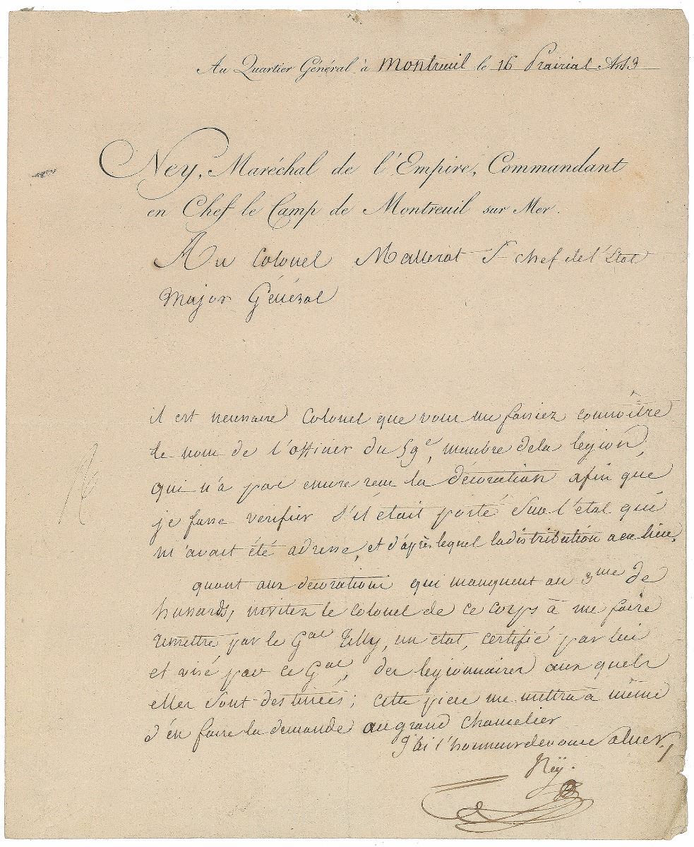 French soldier and military commander during the French Revolutionary Wars and the Napoleonic Wars (1769–1815) who was one of the original eighteen marshals of France created by Napoleon. Rare LS in French, signed “Ney,” one page, 8 x 9.75, June 5, 1805. Untranslated letter concerning military awards to be given to soldiers. In fine condition.