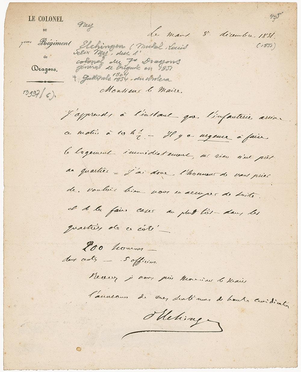 Second Duc d’Elchingen (1804–1854), son of the First Duc d’Elchingen, one of the original 18 Marshals of France created by Napoleon and the only marshal executed for treason, as an “example,” following the restoration of the Bourbon monarchy in 1815. The Second Duc was killed at Gallipoli during the Crimean War. ALS in French, signed “Elchingen,” one page, 8 x 10, Colonel du Régiment de Dragons letterhead, December 8, 1851. An untranslated message on a military matter. In very good condition, with later pencil notations, light intersecting folds (lightly touching signature), a touch of mild toning and soiling, and mild handling wear. RRAuction COA.