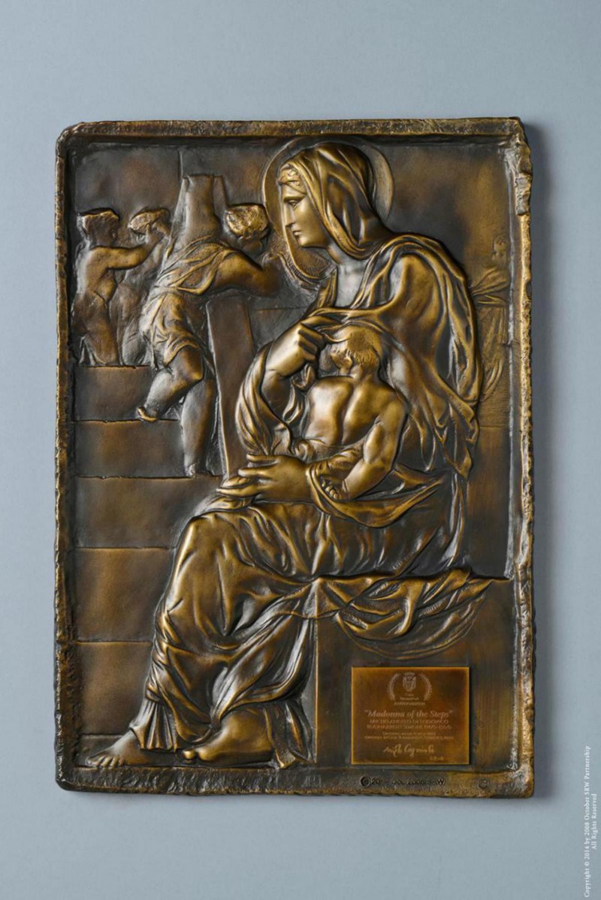 Limited Edition of 475. Signed and Numbered. Dimensions: 17.5”H x 12.25”W x 1”D. Retail: $6,500. Comes with a certificate of Authenticity. Madonna of the Steps is the earliest known sculpture by Michelangelo, created when he was only fifteen or sixteen years old. It remained in the Buonarroti family until two years after the master’s death, when it was presented by a nephew, Leonardo, to Duke Cosimo I. Ten years later, Cosimo II returned it to the Buonarroti family. Michelangelo’s genius is evident as a teenager in this, his first masterpiece, whose figures are so f luid that they look as if they were drawn with a pencil and molded in wax. He admired Donatello’s technique of rilievo schiacciato, a form of shallow relief carving requiring delicate chiseling of the marble, both to model the figures as well as create the sense of recession in space. However, it astonishes us that, as a teenager, Michelangelo’s conception of the Madonna and Child would be so different from the depictions of his predecessors.