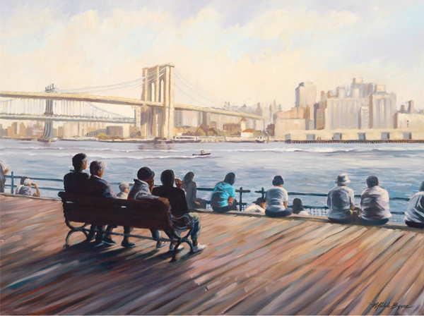 A serene view of the bridge and the East River by the exciting, new American Impressionist who is quickly building a well deserved reputation among critics and collectors. 24x32 in giclee on canvas can be framed without glass like a painting.